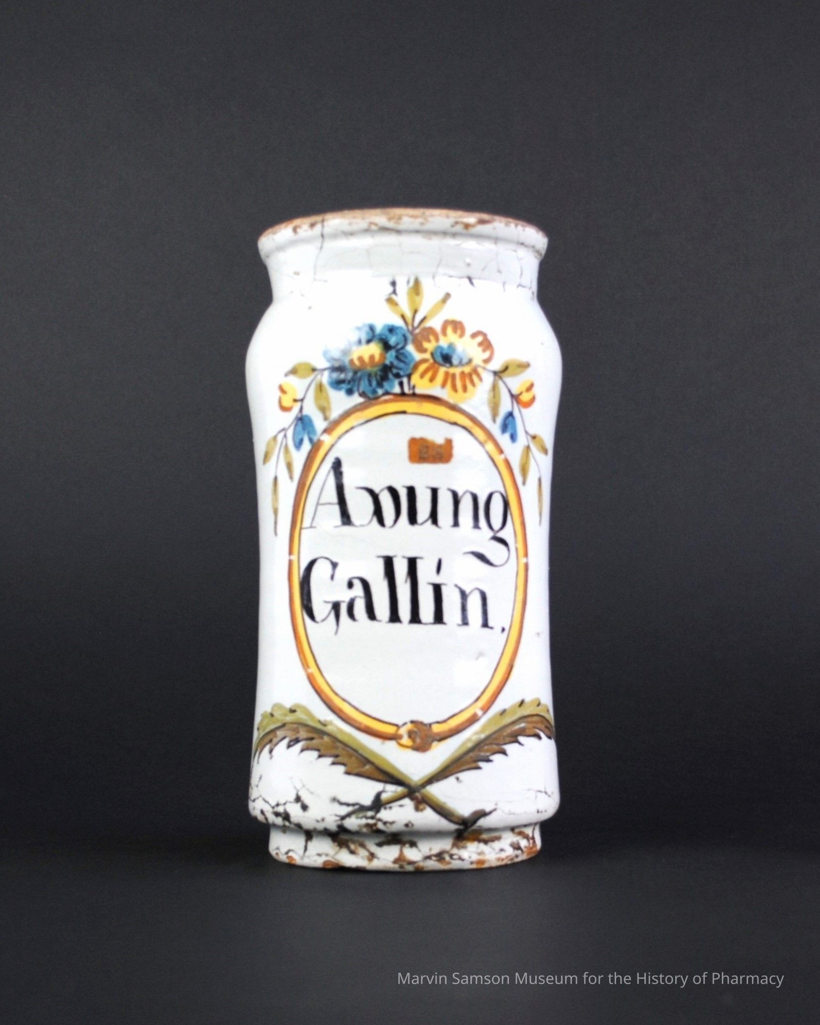 White ceramic albarello from l'Alcora, Spain, decorated with blue and yellow flowers and leaves and a yellow and red oval encircling the Latin abbreviation, "Axung Gallin." [ointment of hen].Collection