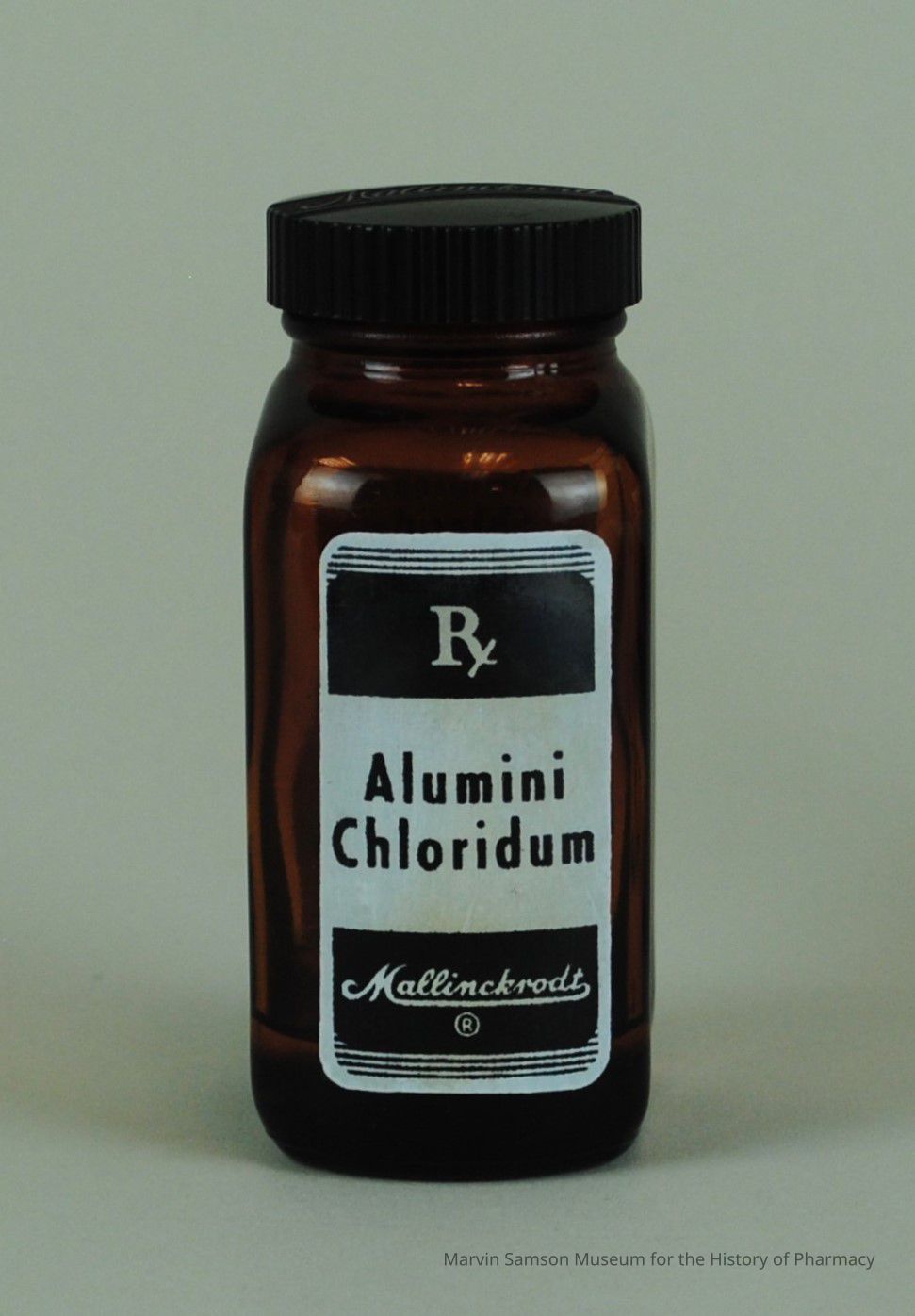 Rectangular glass bottle with screw cap and white labels reading, "Alumini Chloridum" on the front and "Aluminum Chloride N.F." on the backMade/Created