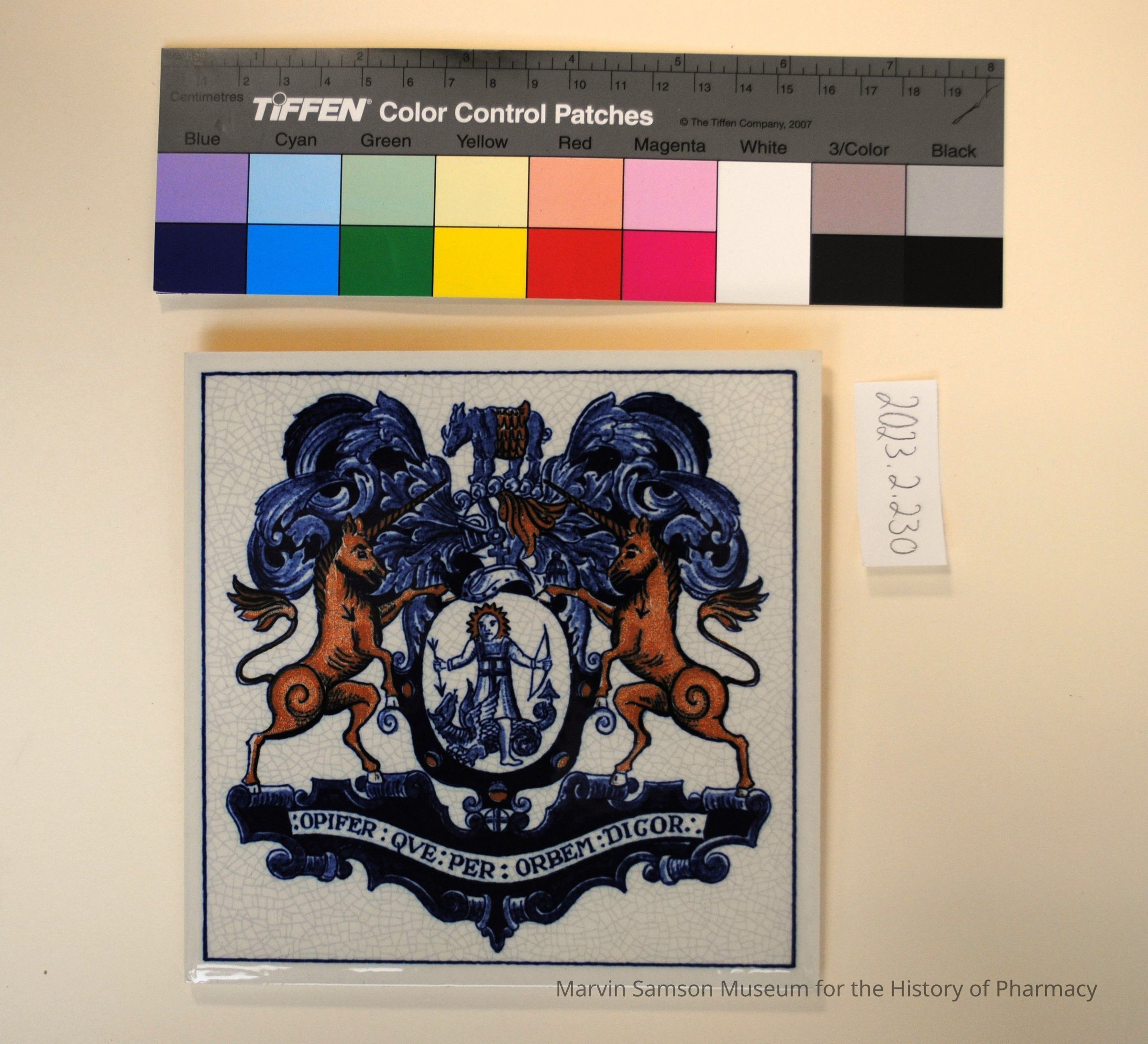 Blue and white ceramic tile depicting the crest of Apollo in blue, white, and gold, banner beneath the crest reads: "Opefer Que Per Orbem Dicor". Part of a set of Dutch Delft tiles depicting 17th century apothecary scenes produced by Burroughs Wellcome Co. between 1982 and 1995 to raise funds for their pharmacy education program.Collection