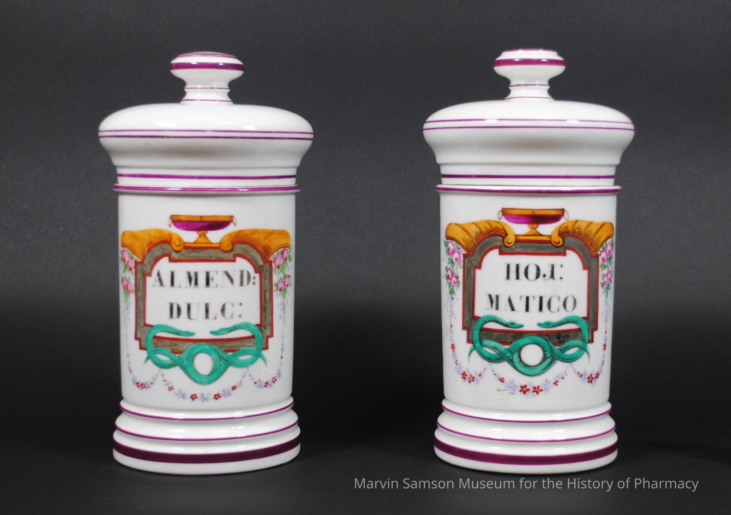 White Limoges porcelain jar decorated with rich purple lines around the edges, and on the front, flower garlands, snakes, and a basin surrounding the words: "ALMEND: DULC:"Made/Created