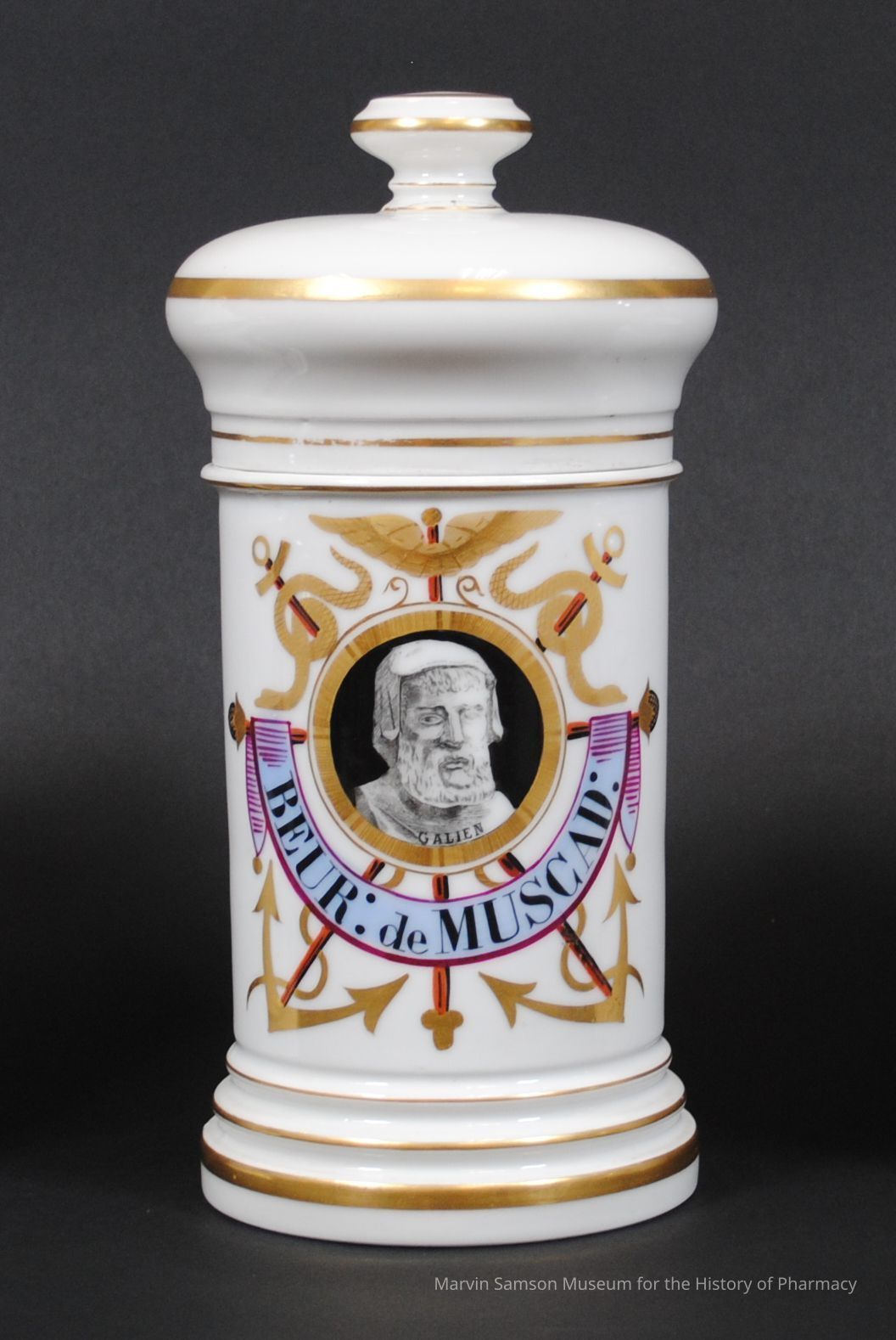 White gilded porcelain apothecary jar decorated with gold and red snakes, wings, swords, and anchors surrounding a circular black and white portrait of a man in religious(?) garb ('GALIEN.') A pink and light blue banner with the words, "BEUR: de MUSCAD:," (likely a French abbreviation translating to "nutmeg butter") hangs below the portrait.Made/Created
