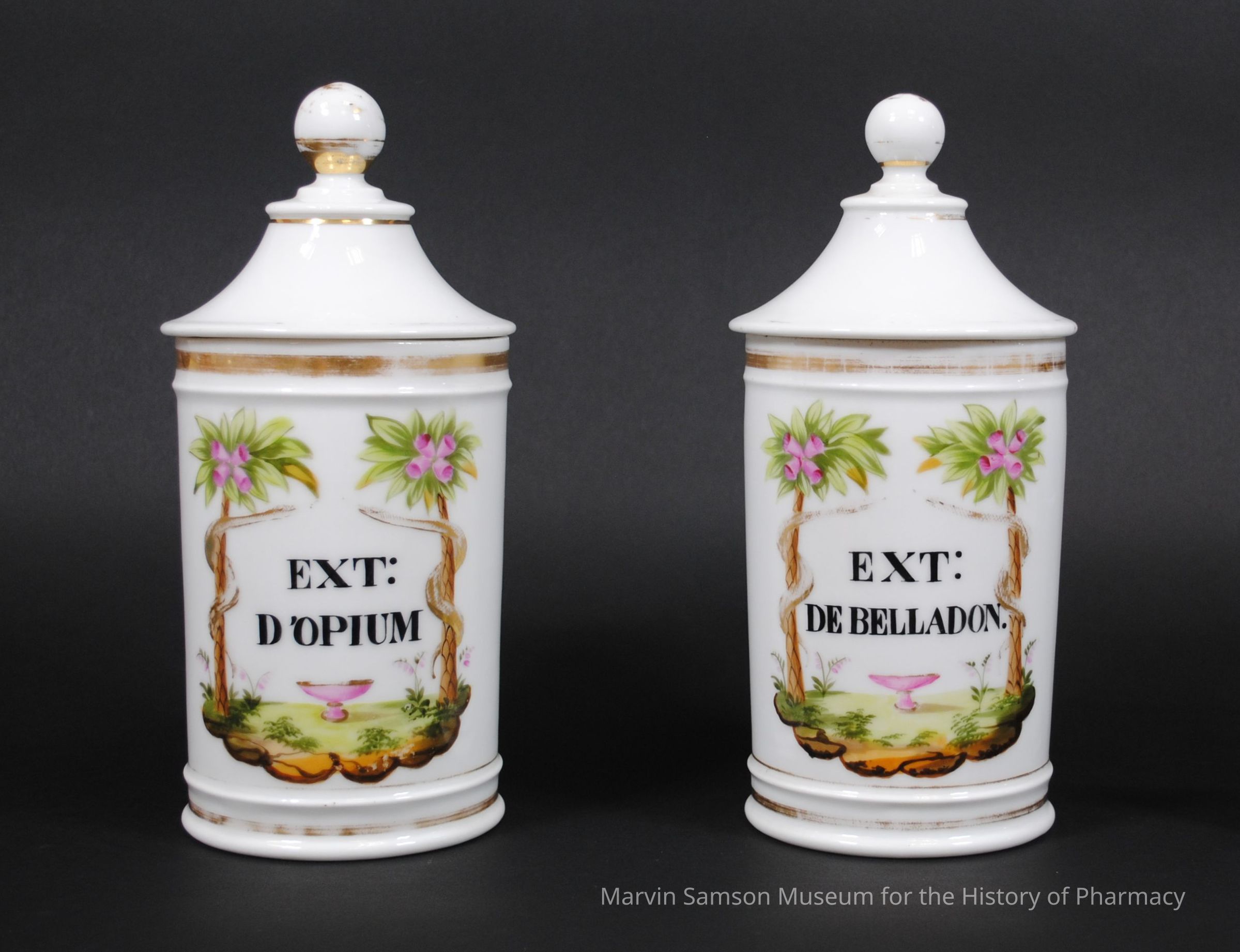 Apothecary jar and canopy lid made of white porcelain and decorated with bands of gilding around the jar lip and base and lid apex. Front of the jar is painted with snakes wrapping around two palm trees framing the words: "EXT: D'OPIUM.," a French abbreviation translating to "opium extract."Made/Created