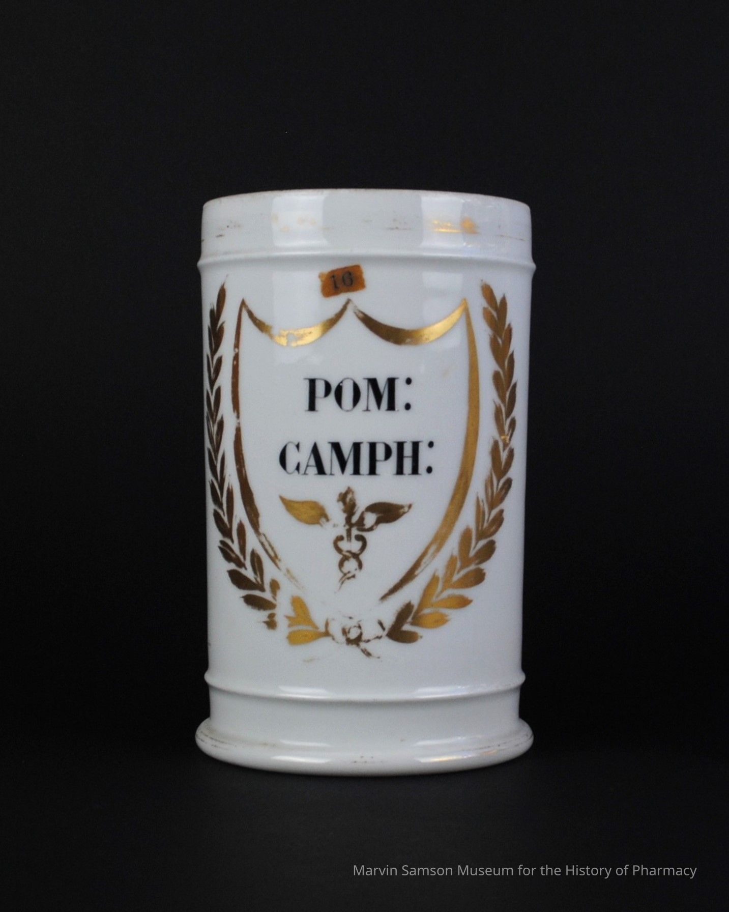 White apothecary jar decorated with golden leaves and shield surrounding the Latin abbreviation, "Pom: Camph:" [pommade of camphor]Collection