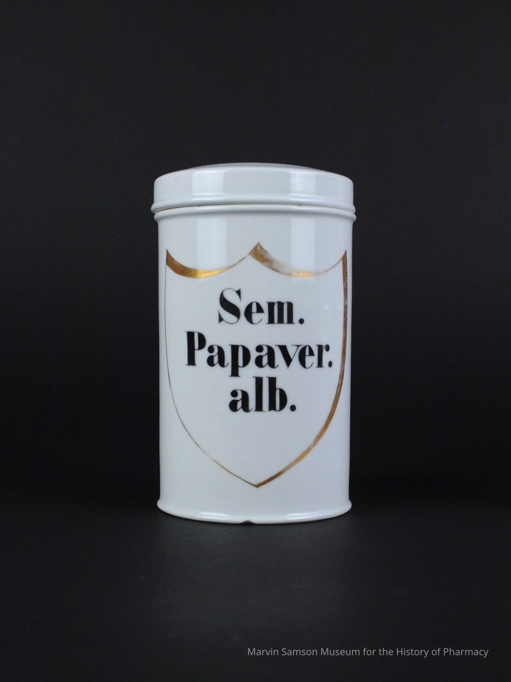 White apothecary jar decorated with a golden shield surrounding the Latin, "Sem. Papaver. alb." [white poppy seeds]Acquisition