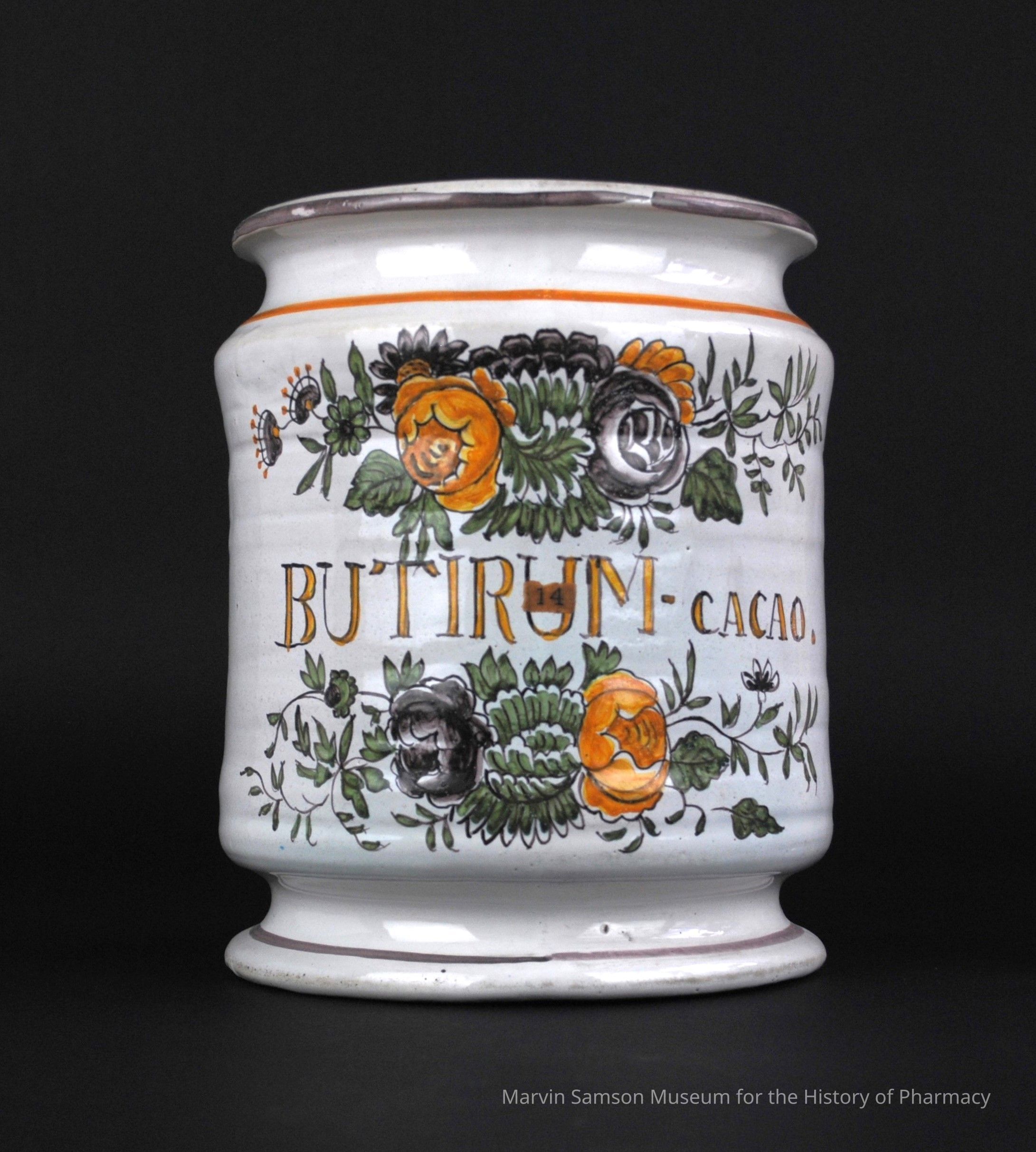Large 18th century Italian ceramic vessel labeled in Latin, "BUTIRUM-CACAO." [cocoa butter], and decorated with flowers in yellows, greens, and greys.Collection