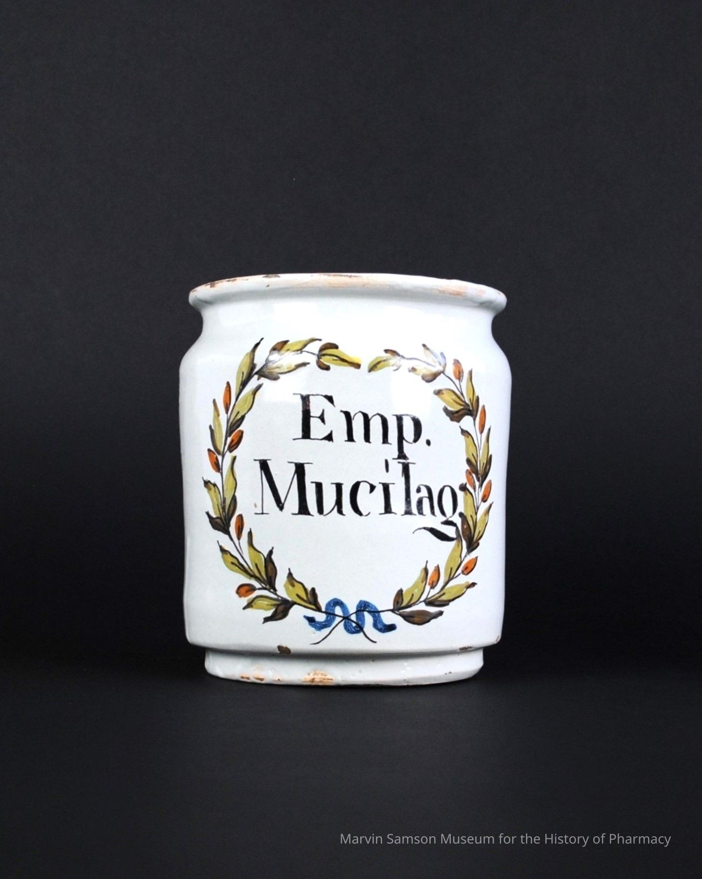 Spanish ceramic apothecary jar, cylindrical with a recessed foot and narrowing at the top to a flared lip. The abbreviated Latin text, "Emp. Mucilag:" [translating to: "in the manner prescribed: mucilage"] is surrounded by a green and orange wreath with a blue snake at its bottom.Collection