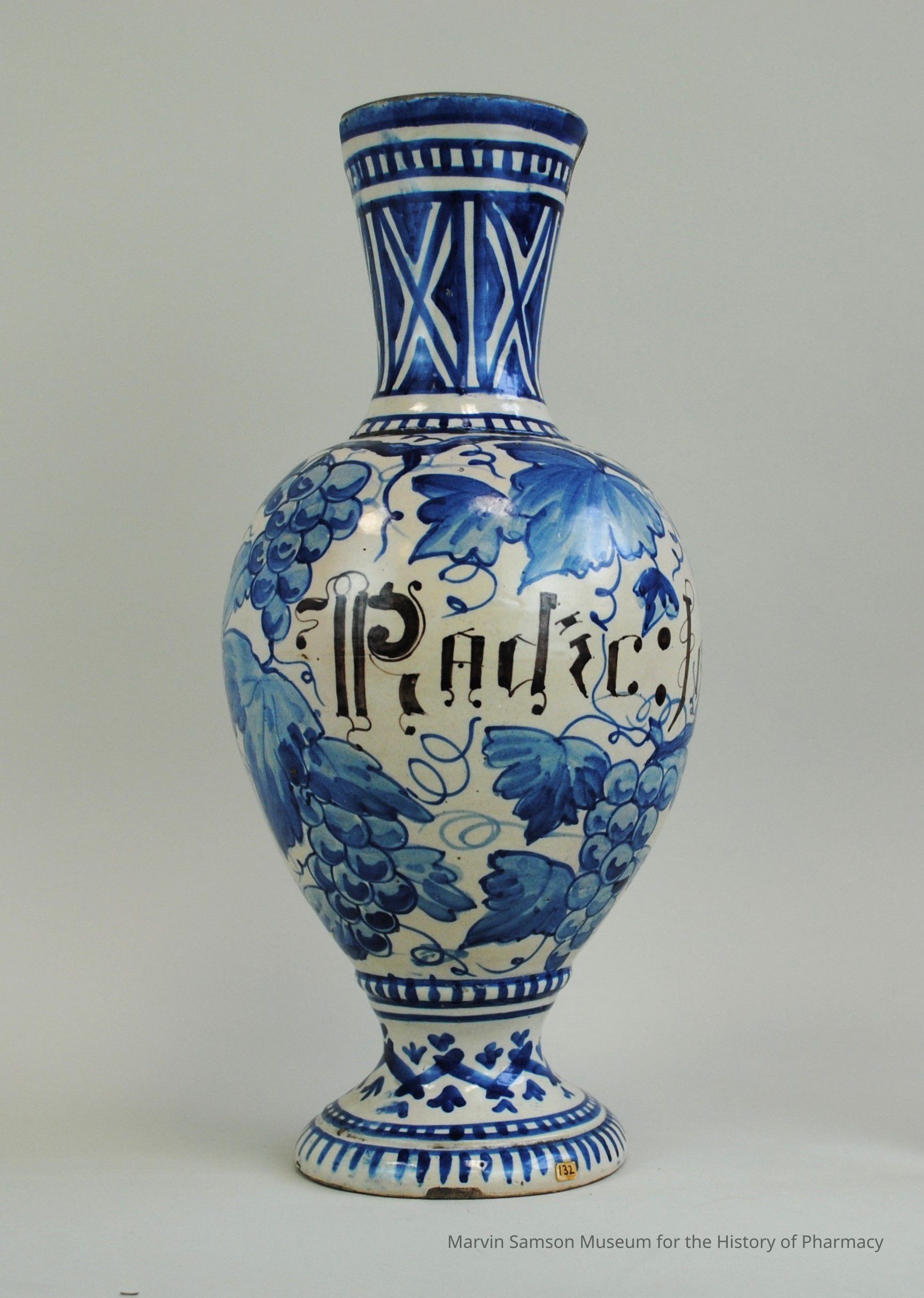 Ceramic apothecary jar with a long narrow neck widening towards the top and a bulbous body narrowing to the junction with a wide foot; the body is painted with blue grape bunches, leaves, and vines; the Latin text, "Radic: Jrid: Floreut" [root of flower], is painted in black amid the grape design; neck and foot are painted with blue geometric designs.Collection