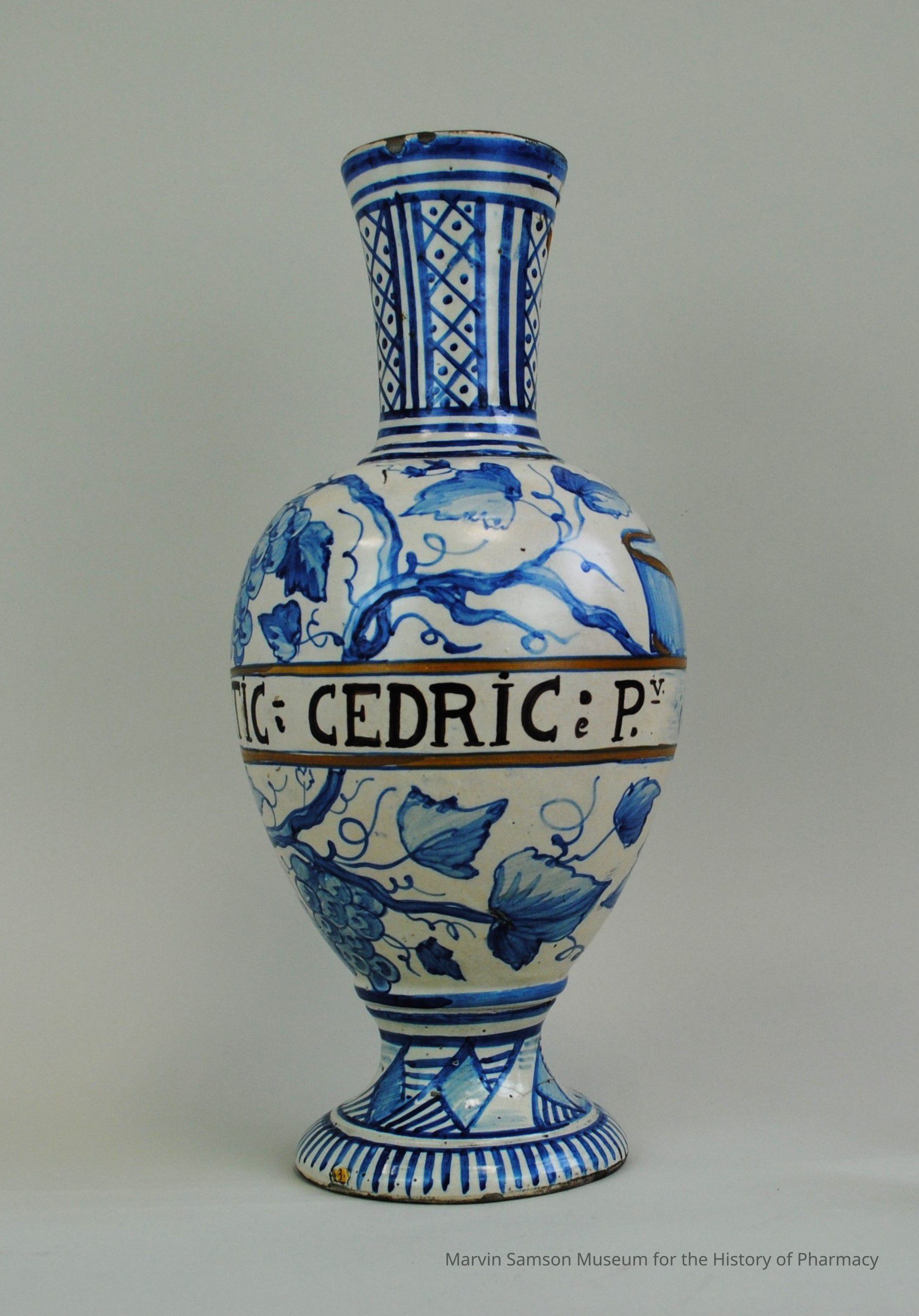 Ceramic apothecary jar with a long narrow neck widening towards the top, bulbous body narrowing to the junction with a wide foot; the body is painted with blue grape bunches and vine design and the Latin text, "Sy: Cdrti t Cedric e P.v." [syrup of cedar, per vaginam], in black in a rectangle outlined in gold amid the grape design; neck and foot are painted with blue geometric designs.Collection