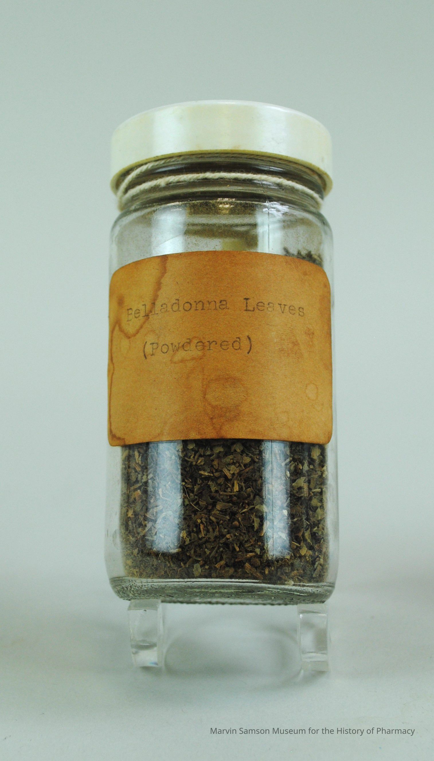 Glass jar labelled and containing powdered belladonna leaves