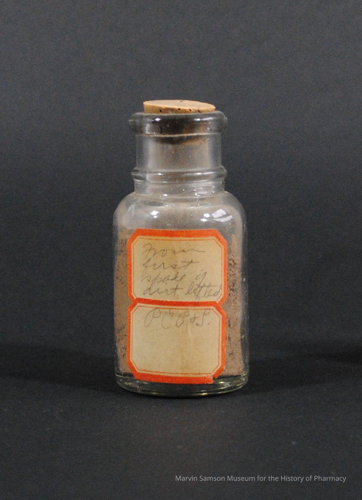Glass bottle with cork stopper containing the "first spade of dirt lifted, PCP&S"Acquisition
