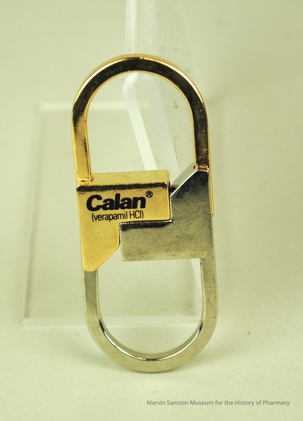 Two-part semi-circular keychain, one half of which is gold in color and the other silver in color, connected together in the middle and black text reading: "Calan (Verapamil HCL)" on both the front of back on the gold pieceMade/Created