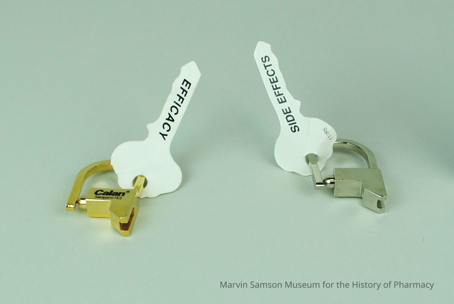 Two-part semi-circular keychain, one half of which is gold in color and the other silver in color, that was originally connected however is now separated. The gold piece has black text reading: "Calan (verapamil HCL) on both the front and back and a paper key on the semi-circle's edge with black text reading "Efficacy". The silver piece has a paper key with black text reading: "Side EffectsMade/Created