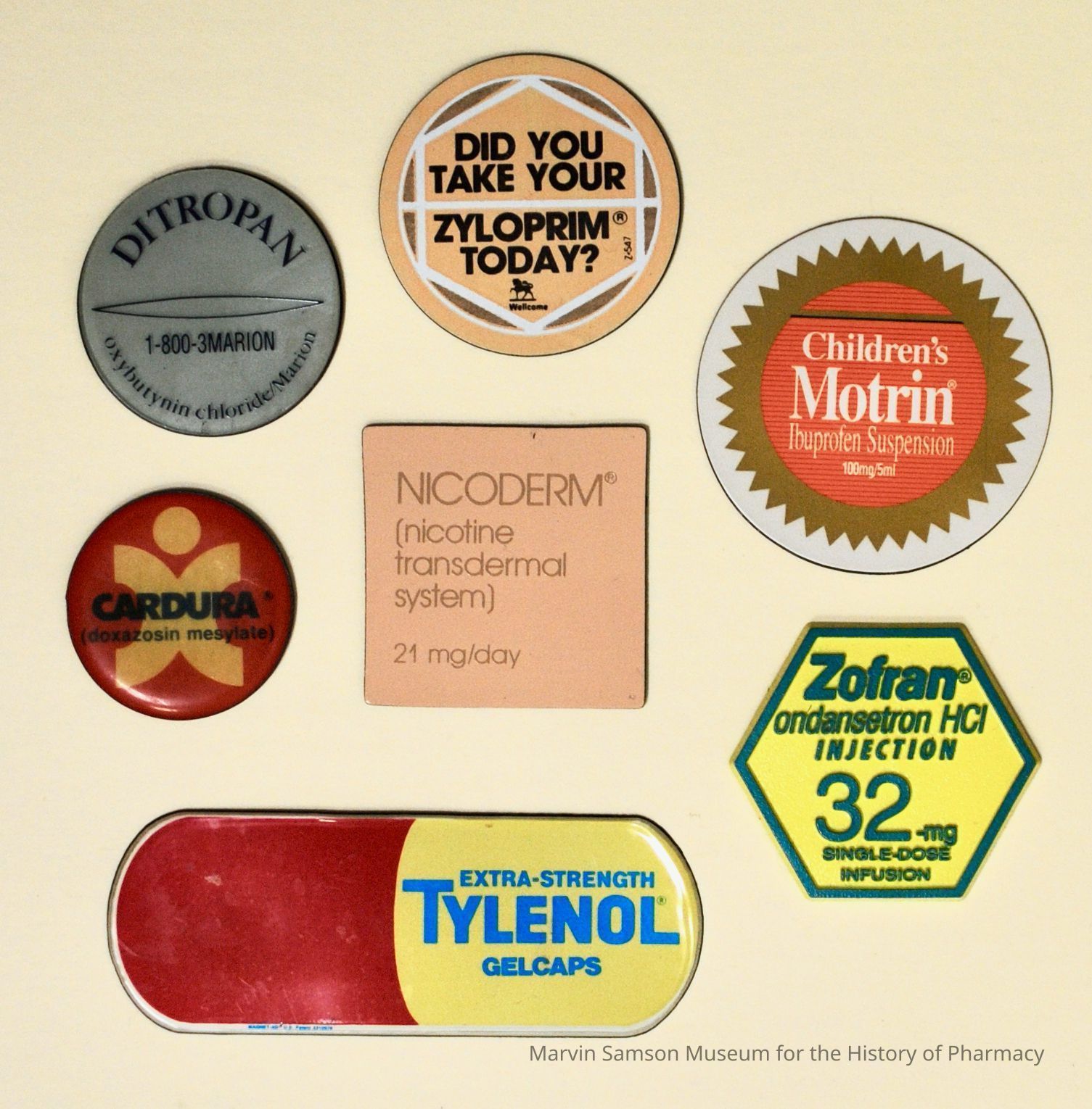 Circular magnet with golden brown geometric sunburst encircling white text on an orange background advertising: "Children's Motrin Ibuprofen Suspension 100 mg/5ml"Made/Created