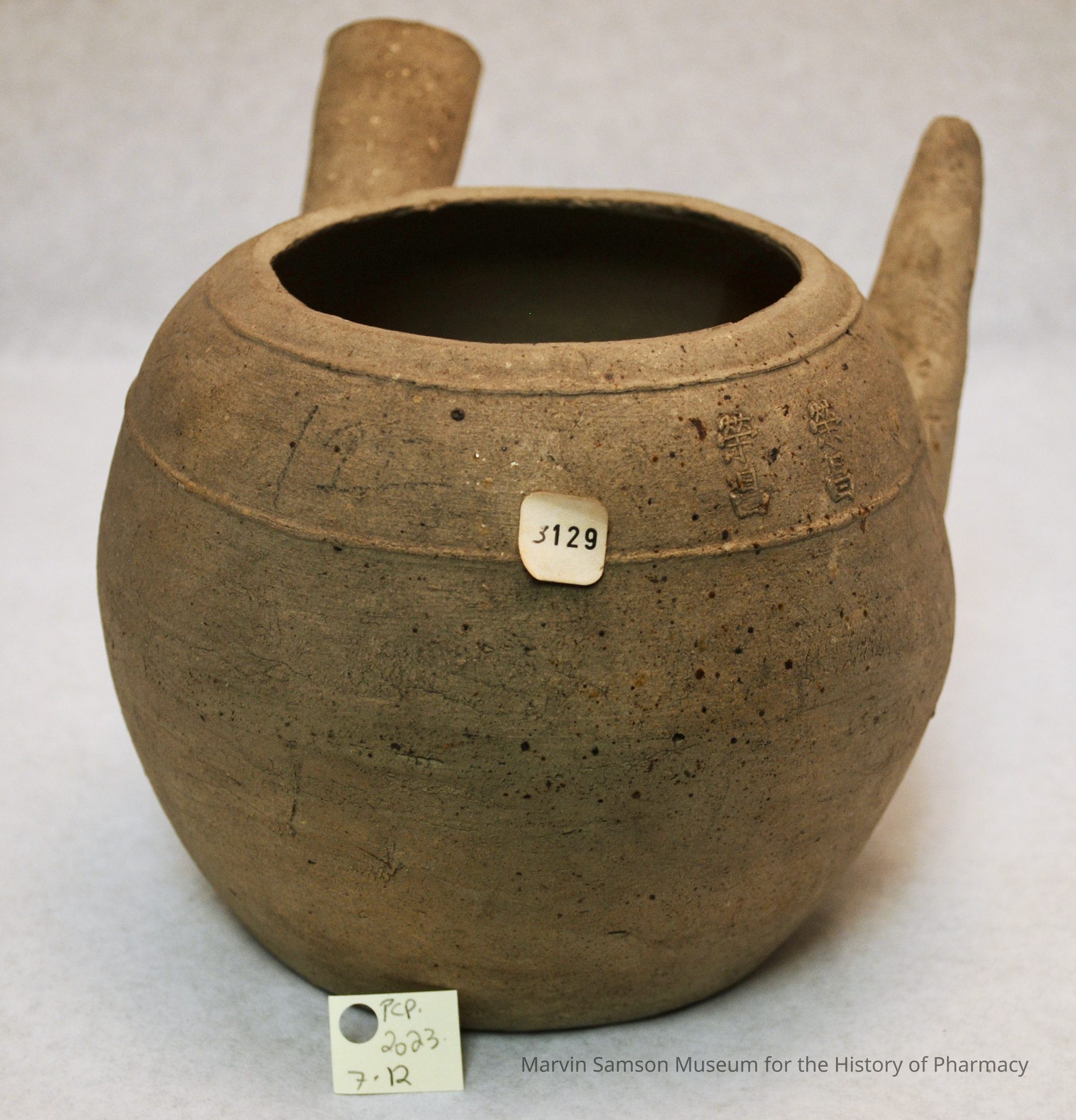 This traditional late 19th- to 20th-century Chinese medicinal ceramic vessel originates from the Rongchang district in Chongqing, China, a region renowned for its pottery craftsmanship. The vessel features two distinct pouring spouts, a design element that suggests it was used for preparing and pouring medicinal herbal concoctions. The double spout may have allowed for precise pouring or mixing of liquids, catering to the specific needs of traditional Chinese medicine practices. Its simple and utilitarian form embodies the understated aesthetic of historical Chinese ceramics, while its functionality reflects the importance of herbal medicine in Chinese culture.
