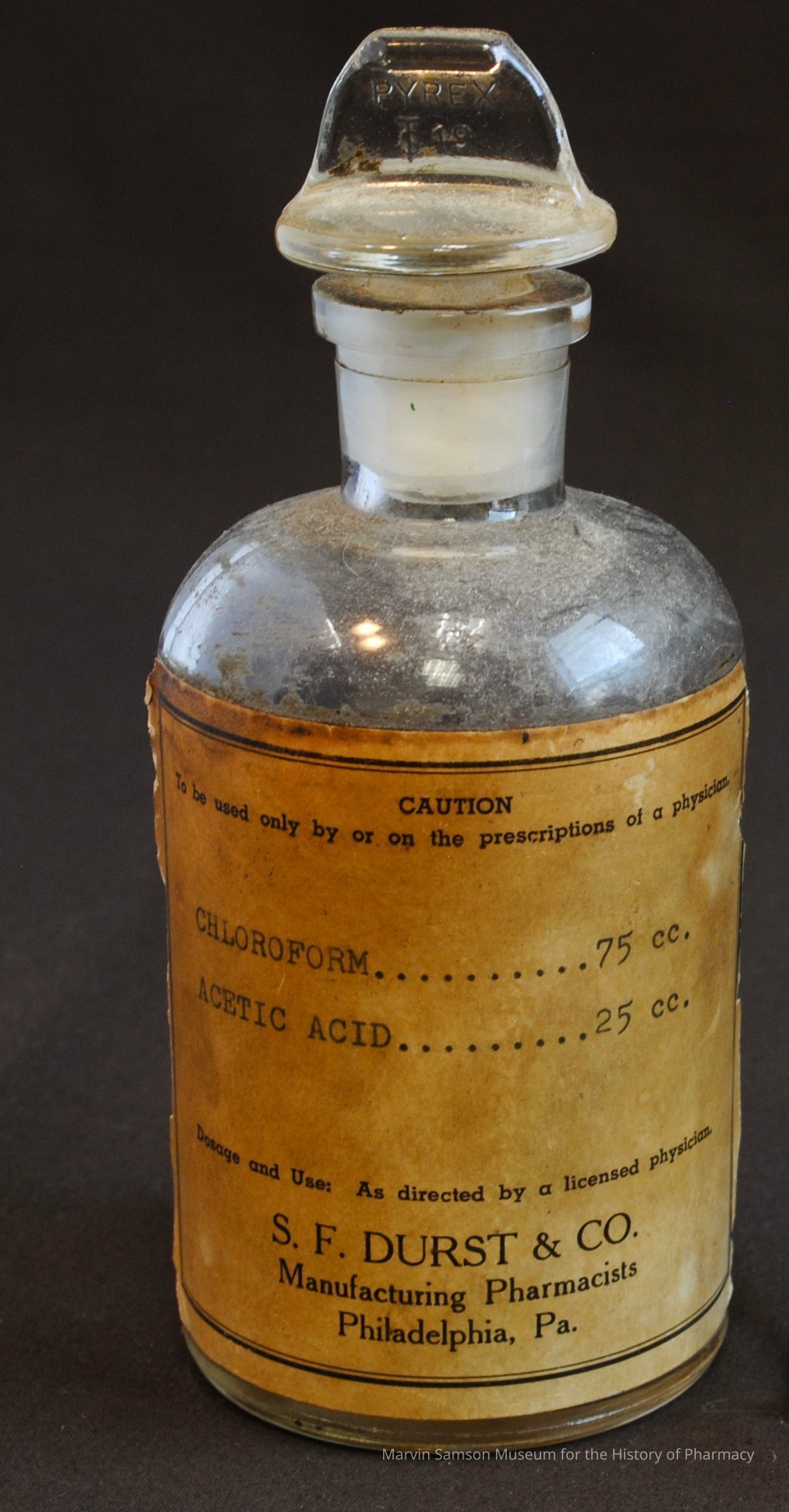 Clear glass "prescription only" bottle of Chloroform and Acetic AcidContext