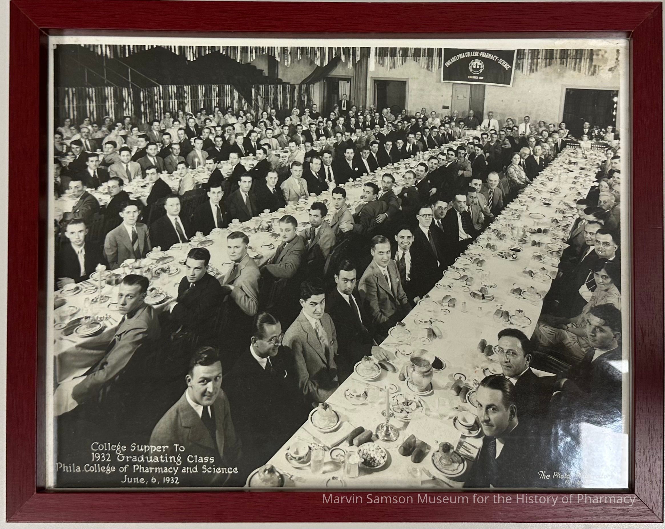 Photograph of the 1932 College Supper for the June 6, 1932, Philadelphia College of Pharmacy and Science graduating class. The photograph, which was likely taken from the top of a ladder, shows five long tables filled with the 1932 PCPS graduating class at dinner. The students, happy and proud, pose for the photograph.Photograph Details