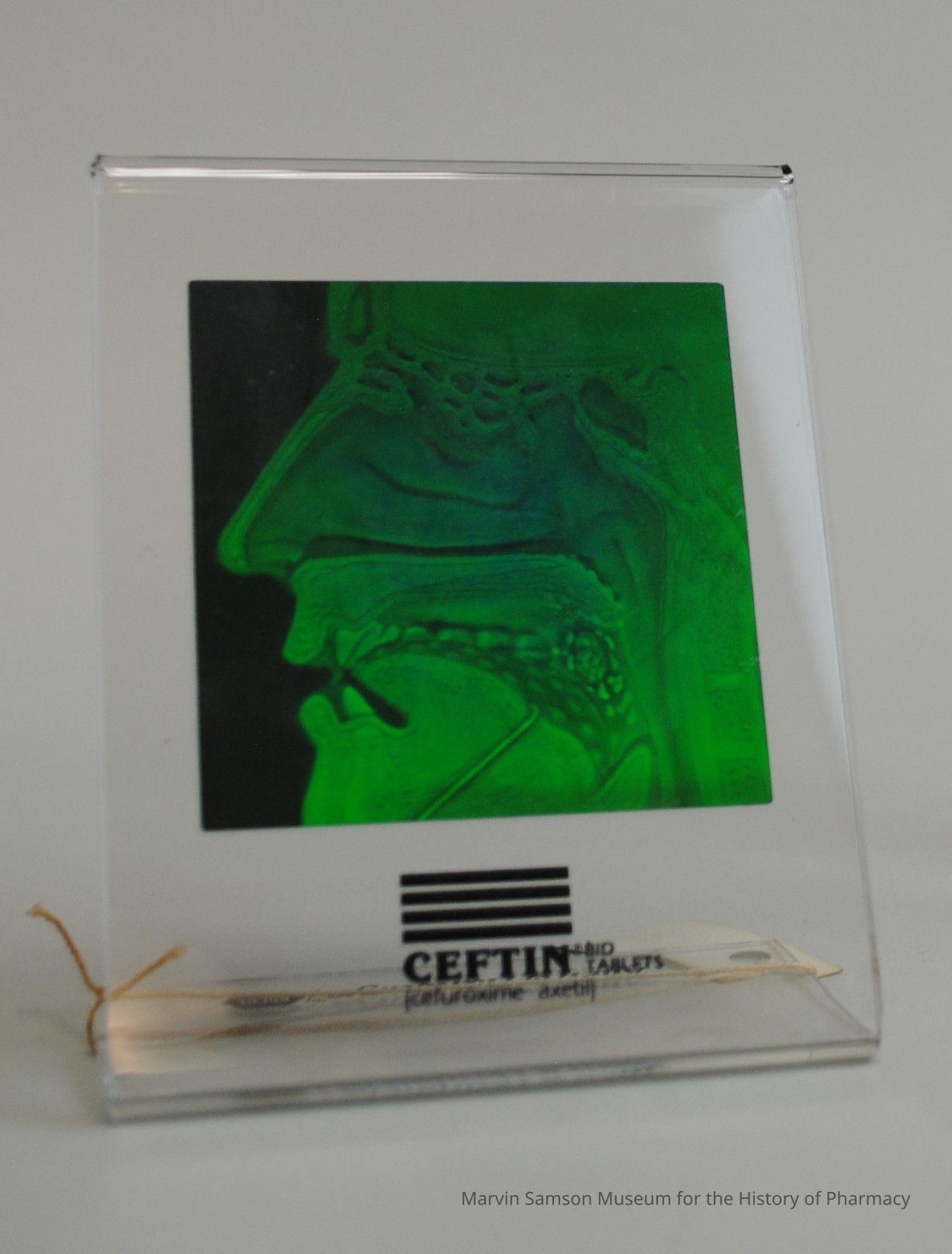 Plexiglass stand with hologrammic image of an x-ray of a human head in profile advertising Ceftin (cefuroxime axetil) tabletsMade/Created