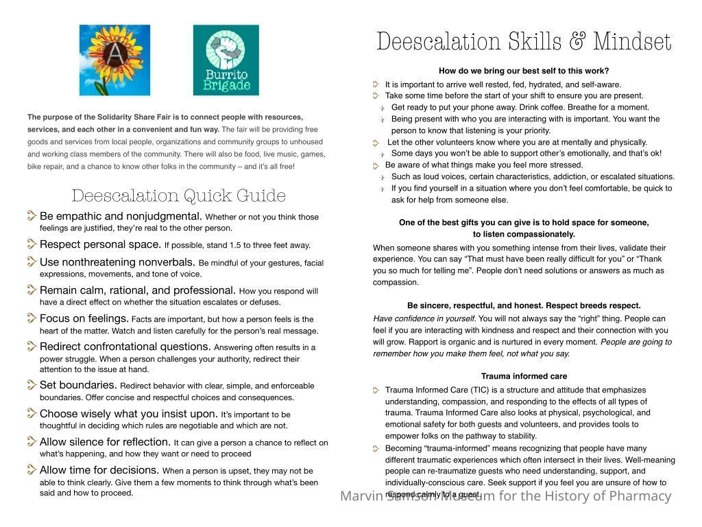 Self-published bi-fold zine by A Neighborhood Collective, Burrito Brigade, and Solidarity Share FairCategory