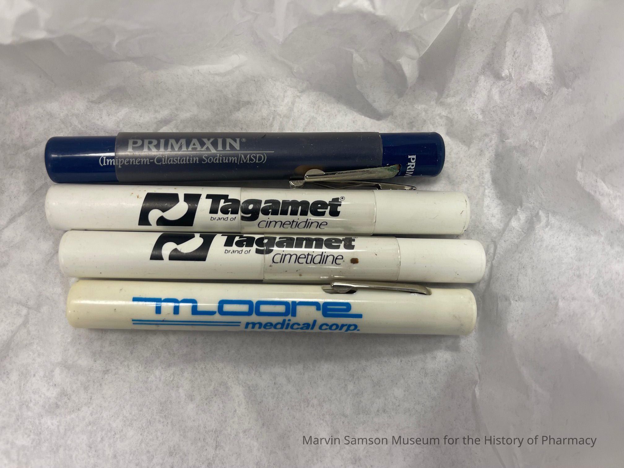 Four small flashlight pens in blues and white: one advertising Moore Medical Corp; one Primaxin; and two Tagamet (cimetidine).Made/Created