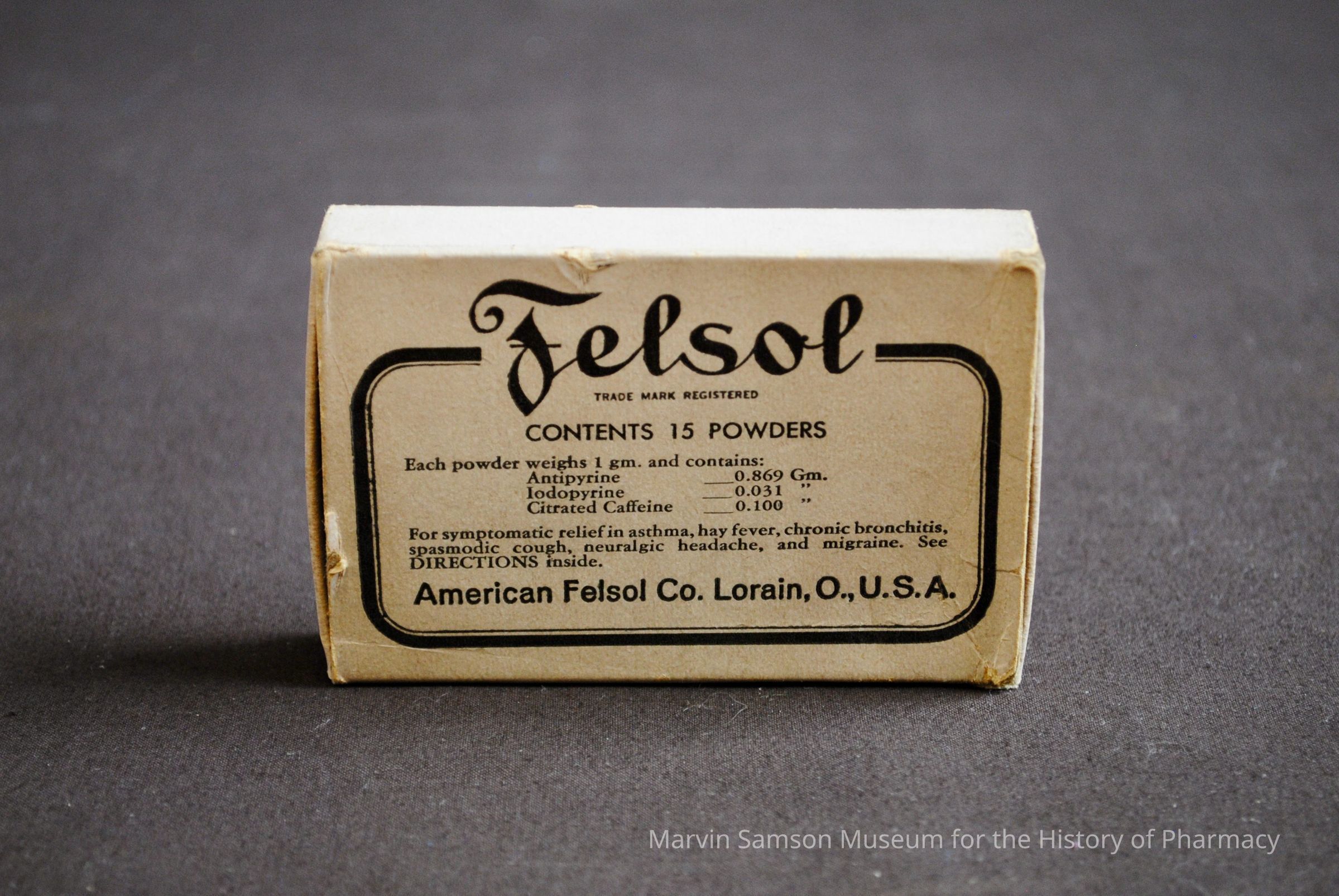 Box of Felsol powders with antipyrine (analgesic, antipyretic and anti-inflammatory drug)