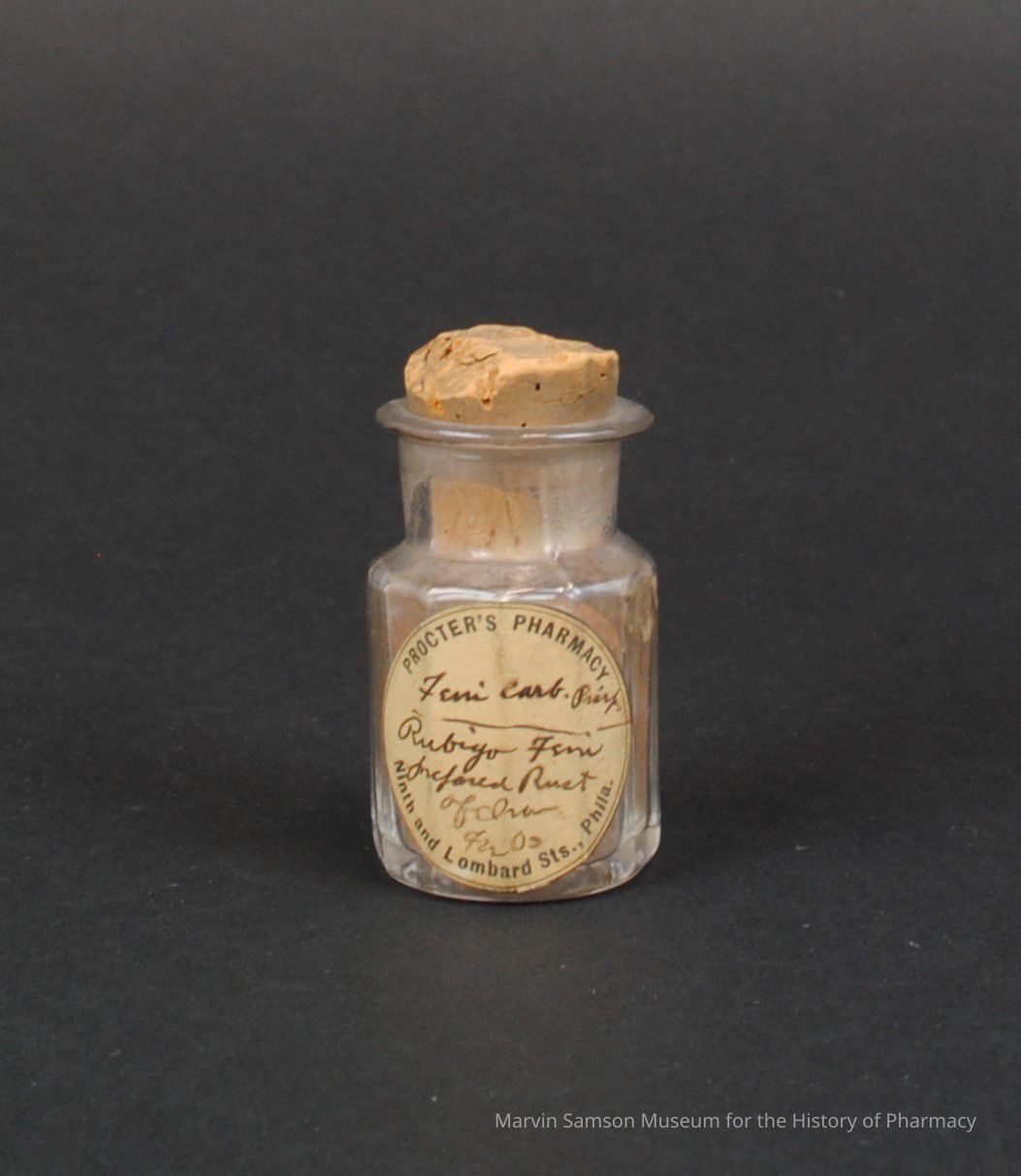The large brown pills held in this beveled glass bottle are an early preparation of ferric carboxymaltose (abbreviated on the bottle’s label as “ferri carb.”), a common antianemic iron supplement still in use today. Hand-prepared and labeled in the pharmacy of William Procter Jr. on Ninth and Lombard Streets, this small artifact provides a rare example of mid-nineteenth century medicine compounding.Context