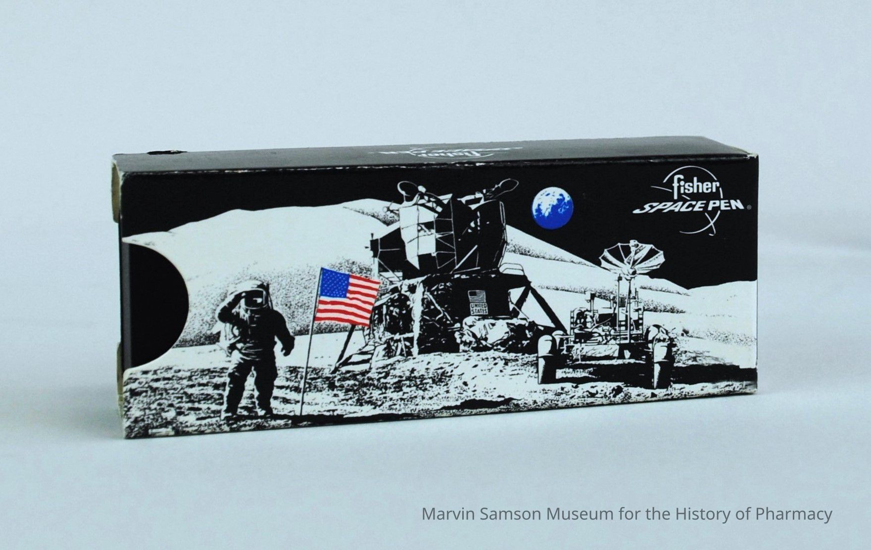 Small metal pen engraved with "ESI Lederle," sitting inside plastic case which fits inside cardboard box printed with a black and white scene of the moon landing with the American flag in the foreground and earth in the background, both in color. Sealed-pressurized ink cartridge pen "writes at any angle, even upside down"Made/Created