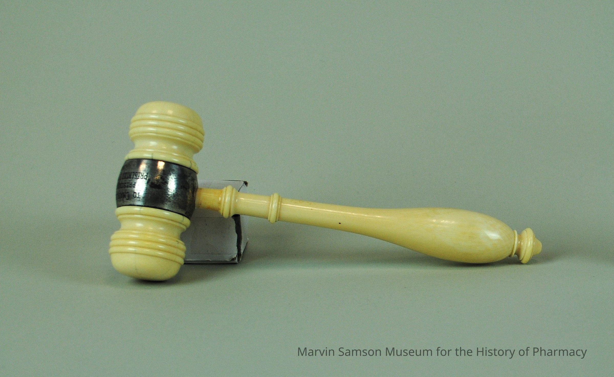 Carved ivory gavel with egraved metal presentation plate wrapped around the center of the head where the gavel handle attaches. The engraving on the plate reads: "To Charles La Wall, President A. Ph. A. [American Pharmacists Association] 1918-19, Presented by Philadelphia Branch, March 5, 1918".Made/Created