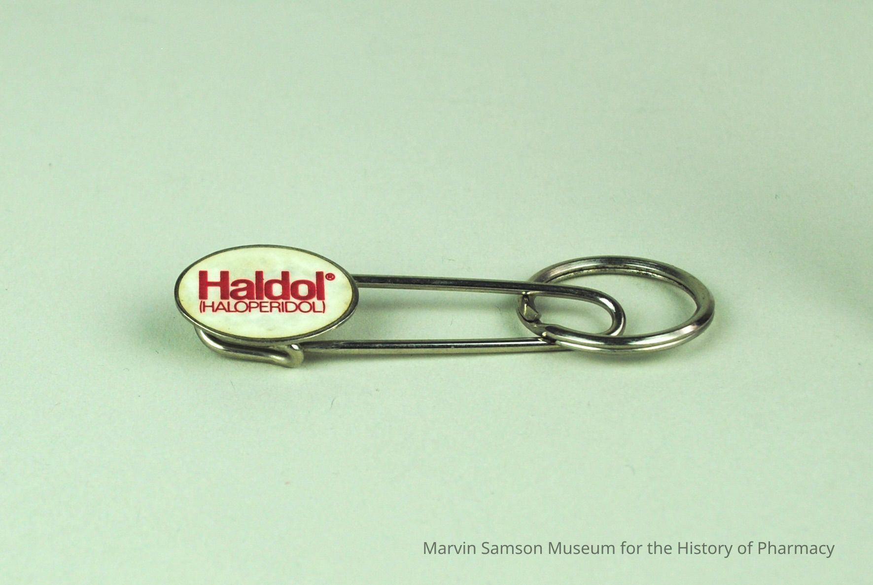 Metal pin key chain with Oval metal face with a white sticker reading: "Haldol (HALOPERIDOL)" in red textMade/Created