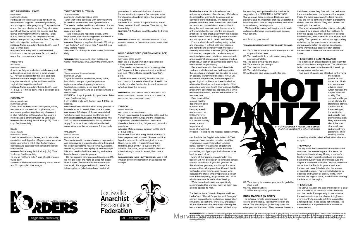 A thorough and classic examination on tried and true herbal treatments for common gynecological problems, as well as great basic sexual health info...The sections include: Body Mapping (in brief), About Menstruation, Love in the Age of Aids, 35 years of fertility, STDs and Other Aliens, The Ovaries and the Uterus, Aphrodisiacs, How to Prepare and Use Herbs, Picking Your Own Herbs, Herbal Properties and Dosages.
