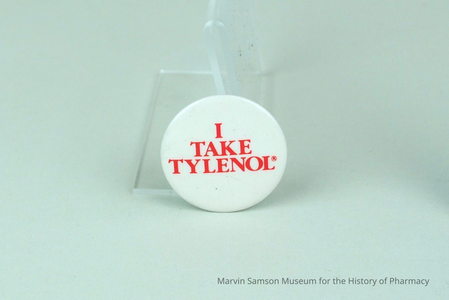 Circular white button with metal pin back printed with red text reading: "I TAKE TYLENOL"Made/Created