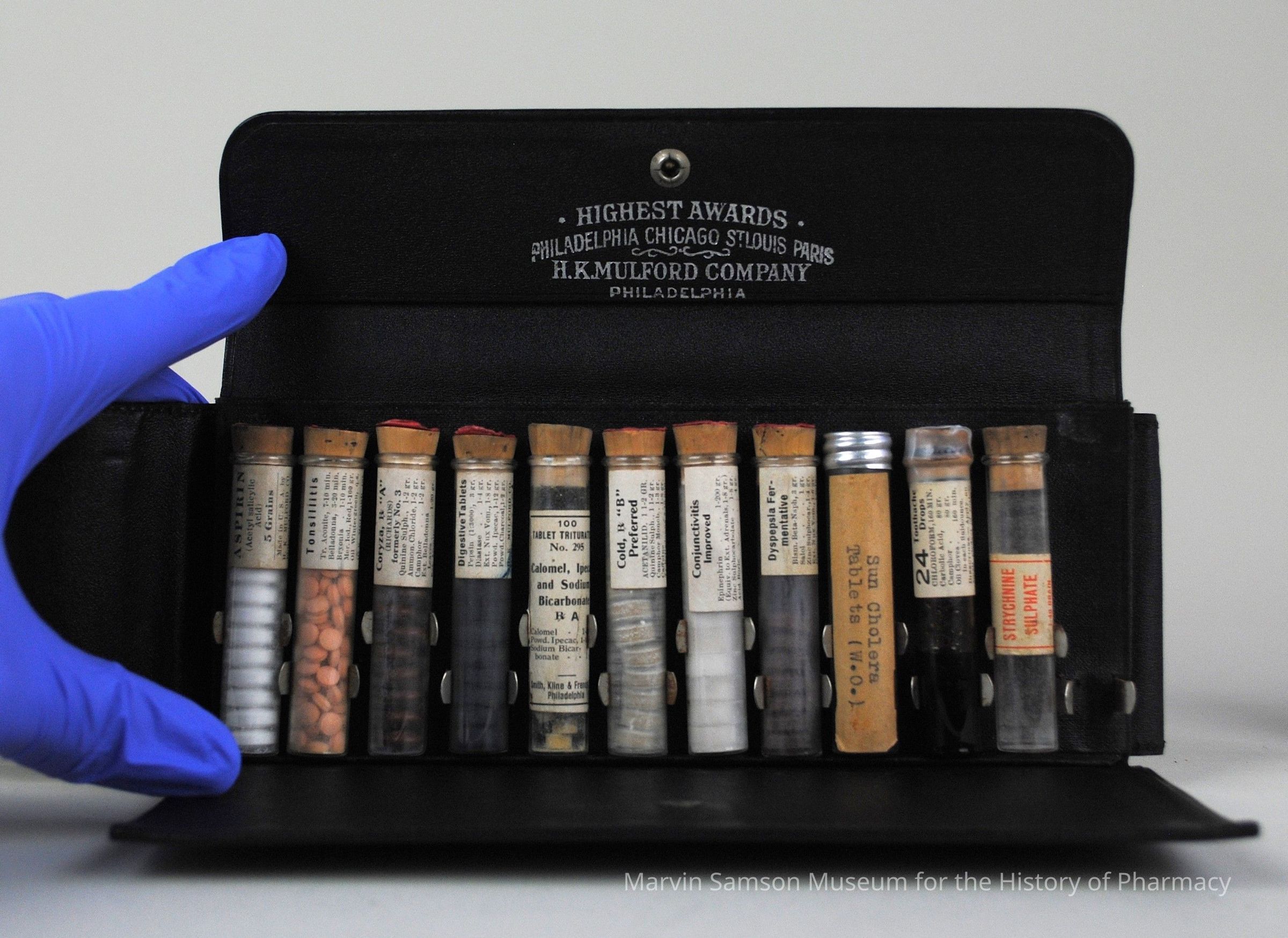 Black leather medicine case from H.K. Mulford Co. belonging to Joseph W. England and containing twelve glass medicine vials, one each of: aspirin; tonsillitis; coryza; digestive tablets; triturates No. 295; cold "B";