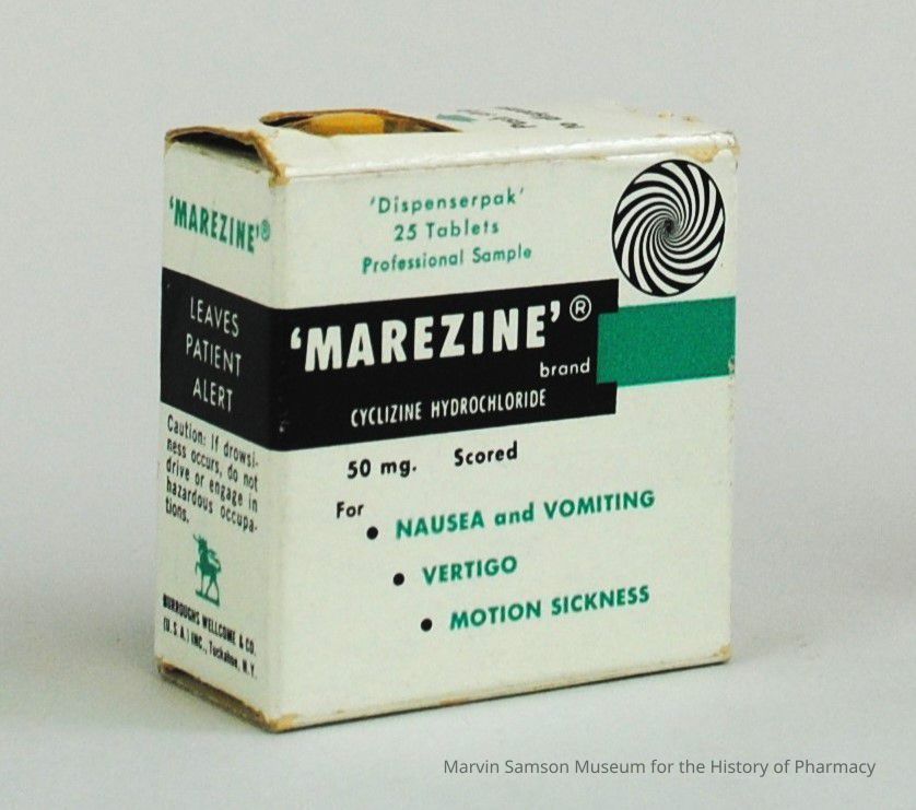 White cardboard 'dispensepak' box with 25 50mg yellow "Marezine" cyclizine hydrochloride tabletsCollection