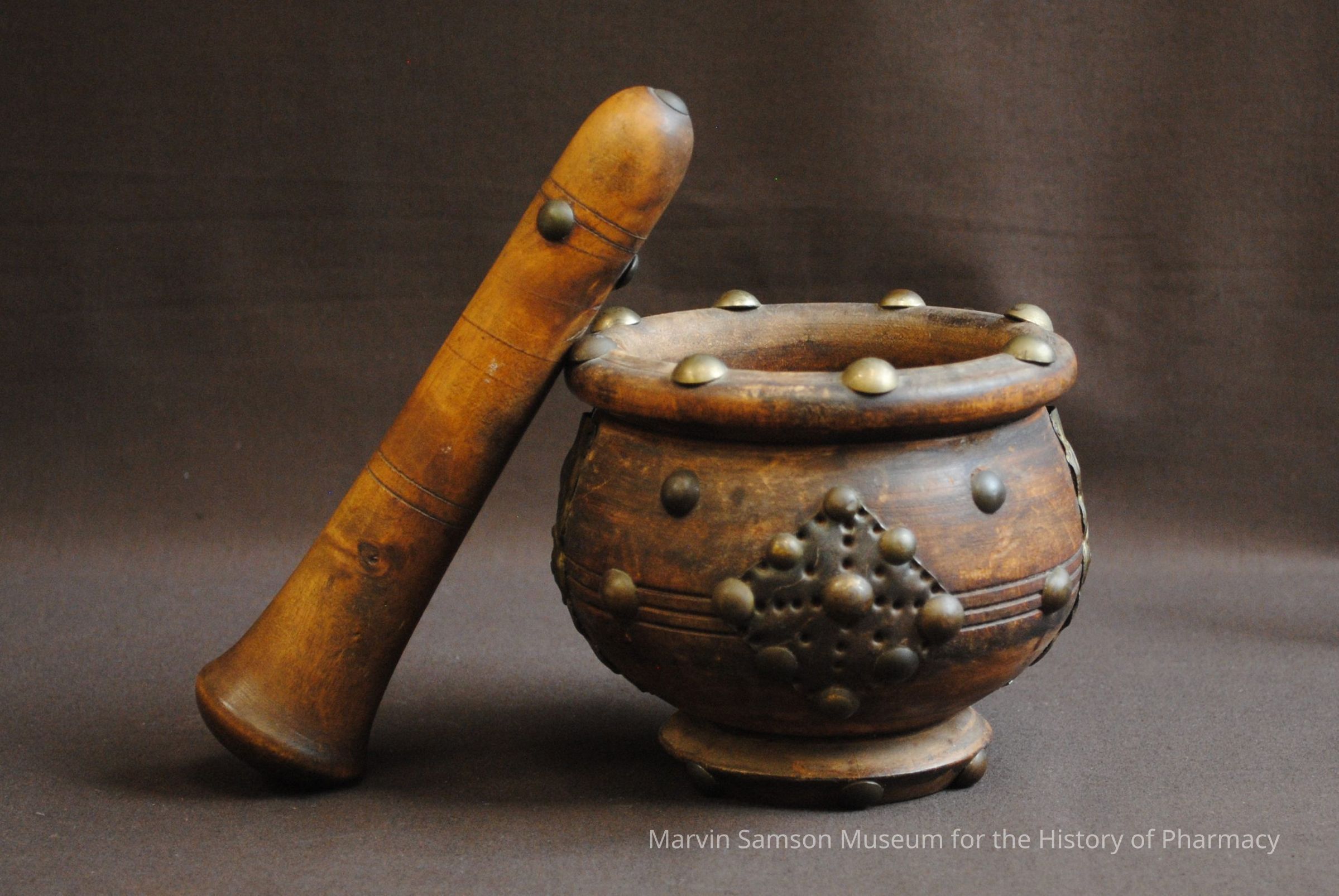 Wooden round mortar and pestle with decorative metal studsContext