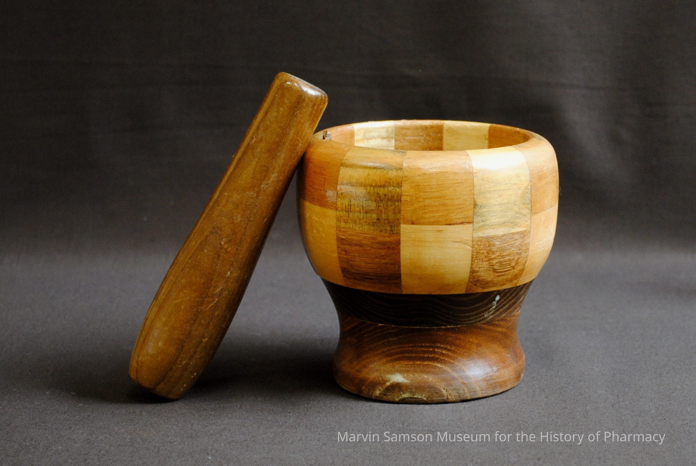 From Alan Strauss' 'A Collection of Mortar and Pestle Sets,' p.5: "Wood mortar and pestle sets were and still are most usually made by skilled craftsmen. They are not usually used to prepare medical products because they are very porous and any medication made in them would be contaminated with some of the previous product made in the same mortar. Their main function is decorative, although occasionally someone may use one in the kitchen to grind up spices. This would work if the material is the only item ever used in that particular mortar."Collection