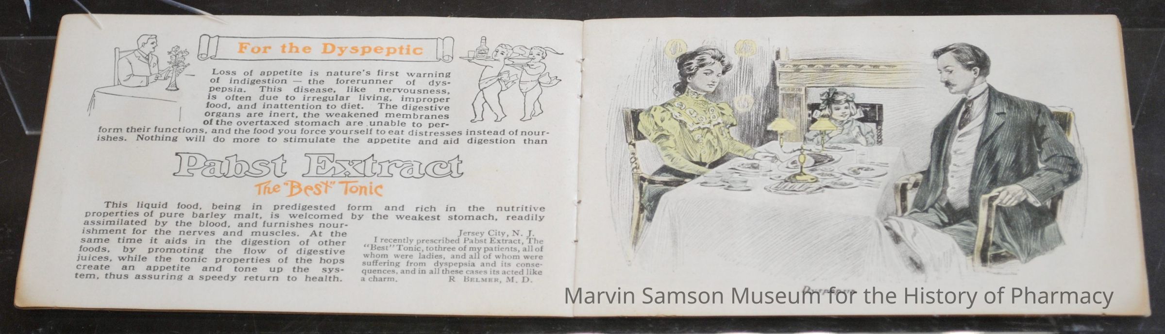 One of the most amusing items is the 1908 pamphlet titled Health Darts, which is an extended advertisement for the cure-all "Pabst Extract - The 'Best' Tonic". On consecutive pages of the pamphlet, the tonic is touted as being helpful for: the convalescent; the overworked; the nervous; the dyspeptic (i.e. someone who is irritable due to depression or indigestion) [page opening displayed]; insomnia; mother and baby; the anemic; and old age.