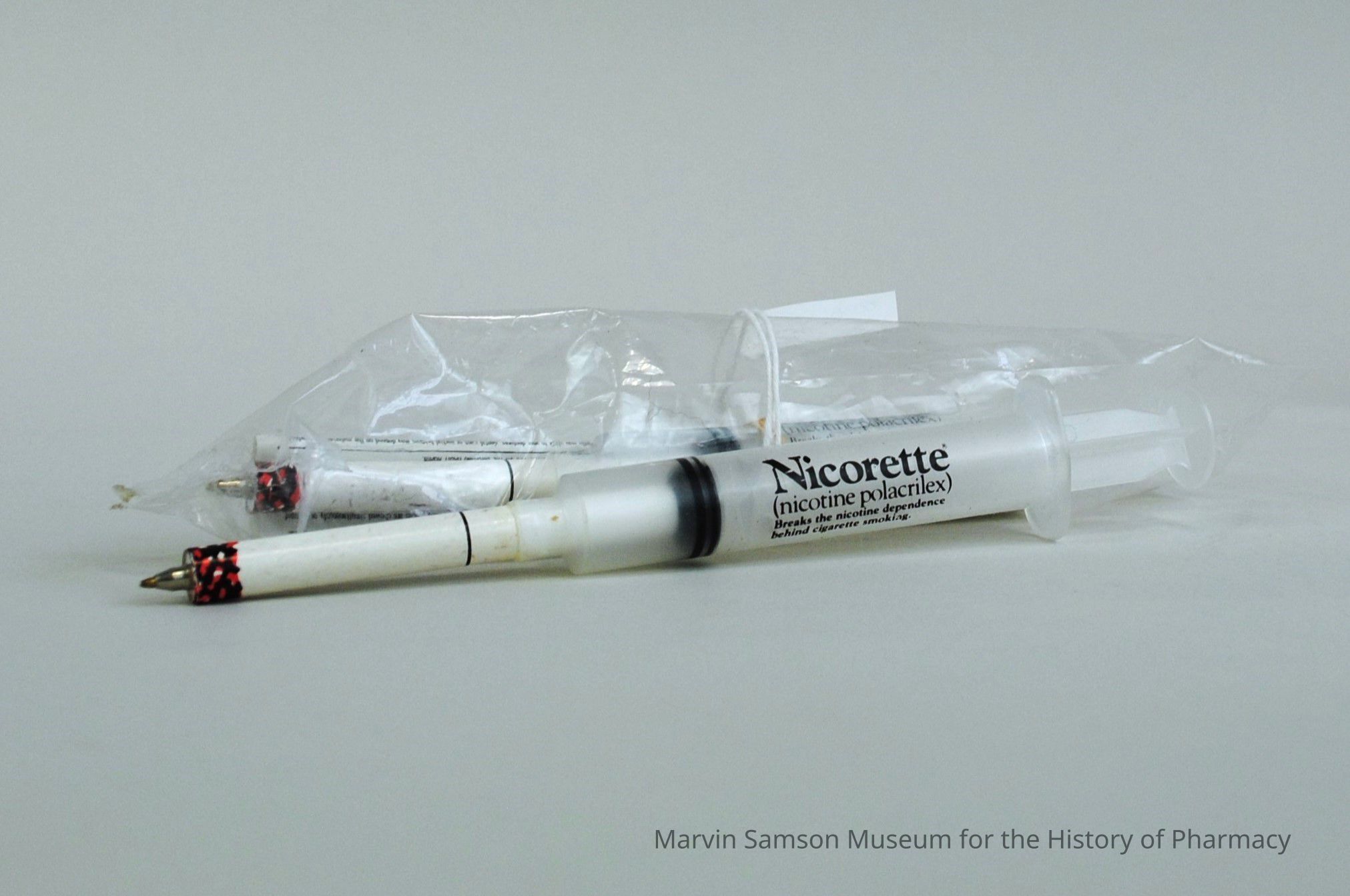Two pens each in the shape of a cigarette attached to a syringe printed with Nicorette (nicotine polacrilex) and tagline: "Breaks the nicotine dependence behind cigarette smoking"; one includes pamphlet on NicoretteMade/Created