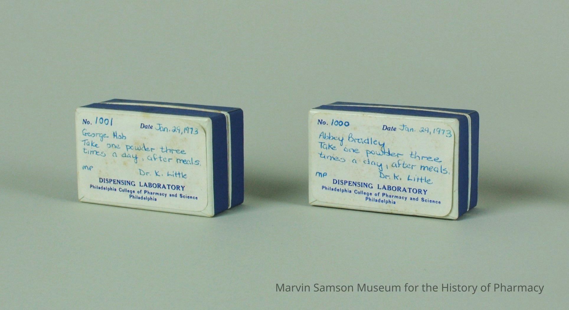 Small blue and white cardboard prescription box for George Hab, labeled No. 1001 and dated January 29, 1973. Contain small folded white paper packets of powders. Prescribed by Dr. K. Little of the Philadelphia College of Pharmacy and Science Dispensing Laboratory. Written on the label on top of the box in blue ball-point pen are the instructions: "Take one powder three times a day, after meals."Category