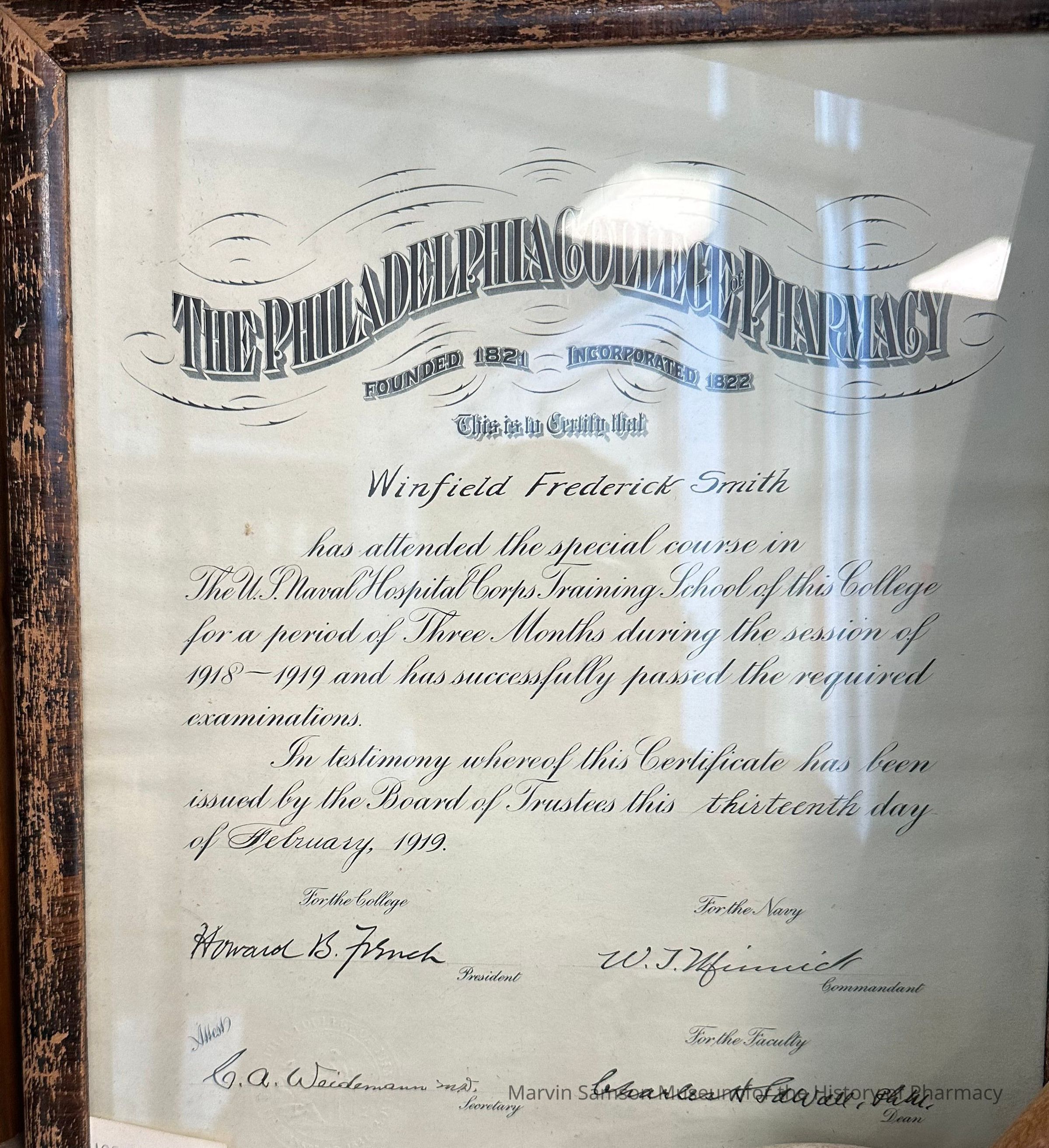 Framed certificate issued by the Philadelphia College of Pharmacy to Winfield Frederick Smith on February 13th, 1919. This certificate certifies Winfield Frederick Smith’s attendance to a special course in the U.S. Naval Hospital Corps Training School for 3 months and passing the required exams.Category