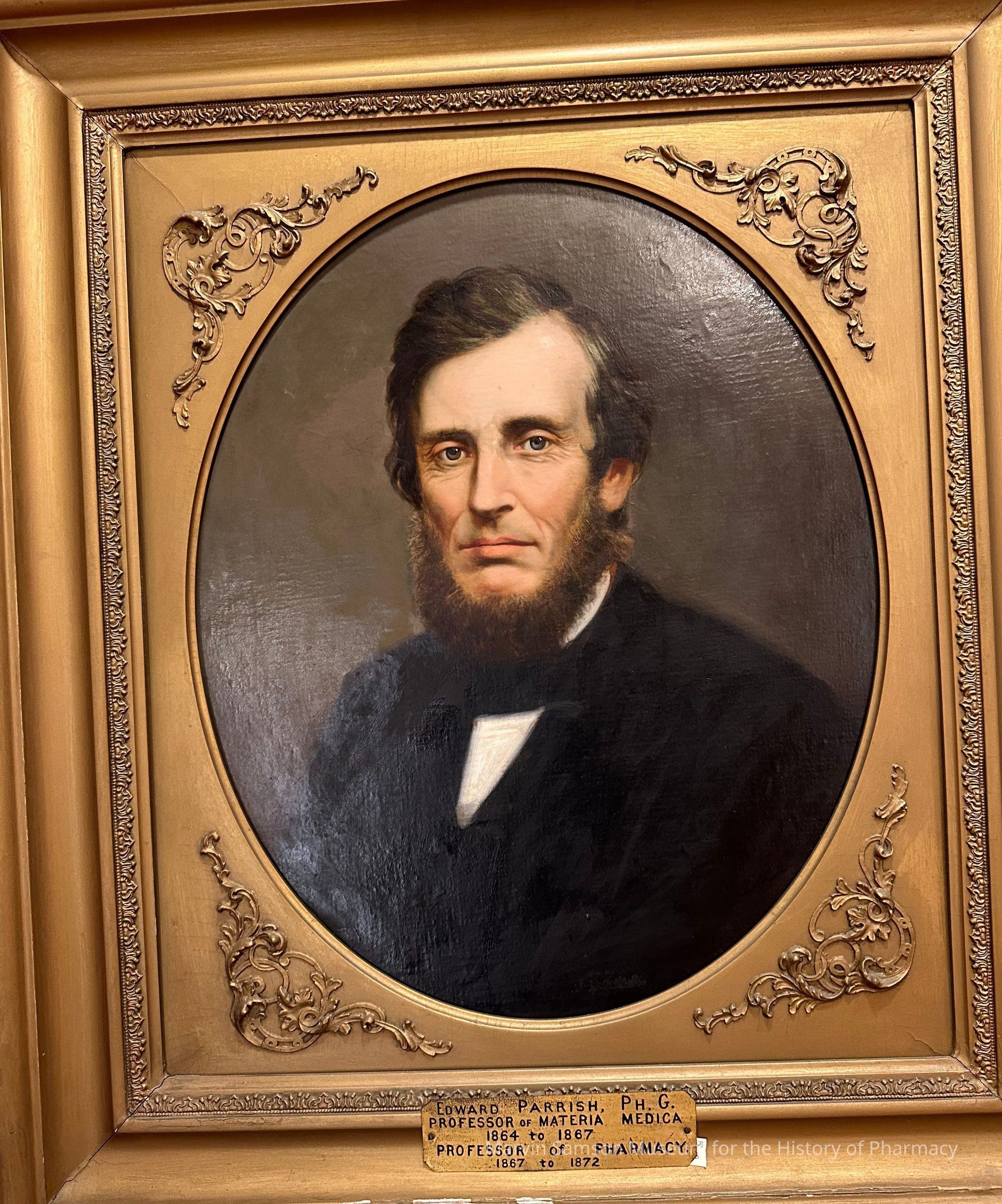 Portrait of Edward Parish, Ph. G. - professor of materia medica 1864 to 1867 and professor of pharmacy 1867 to 1872 in an ornate frameType of Painting