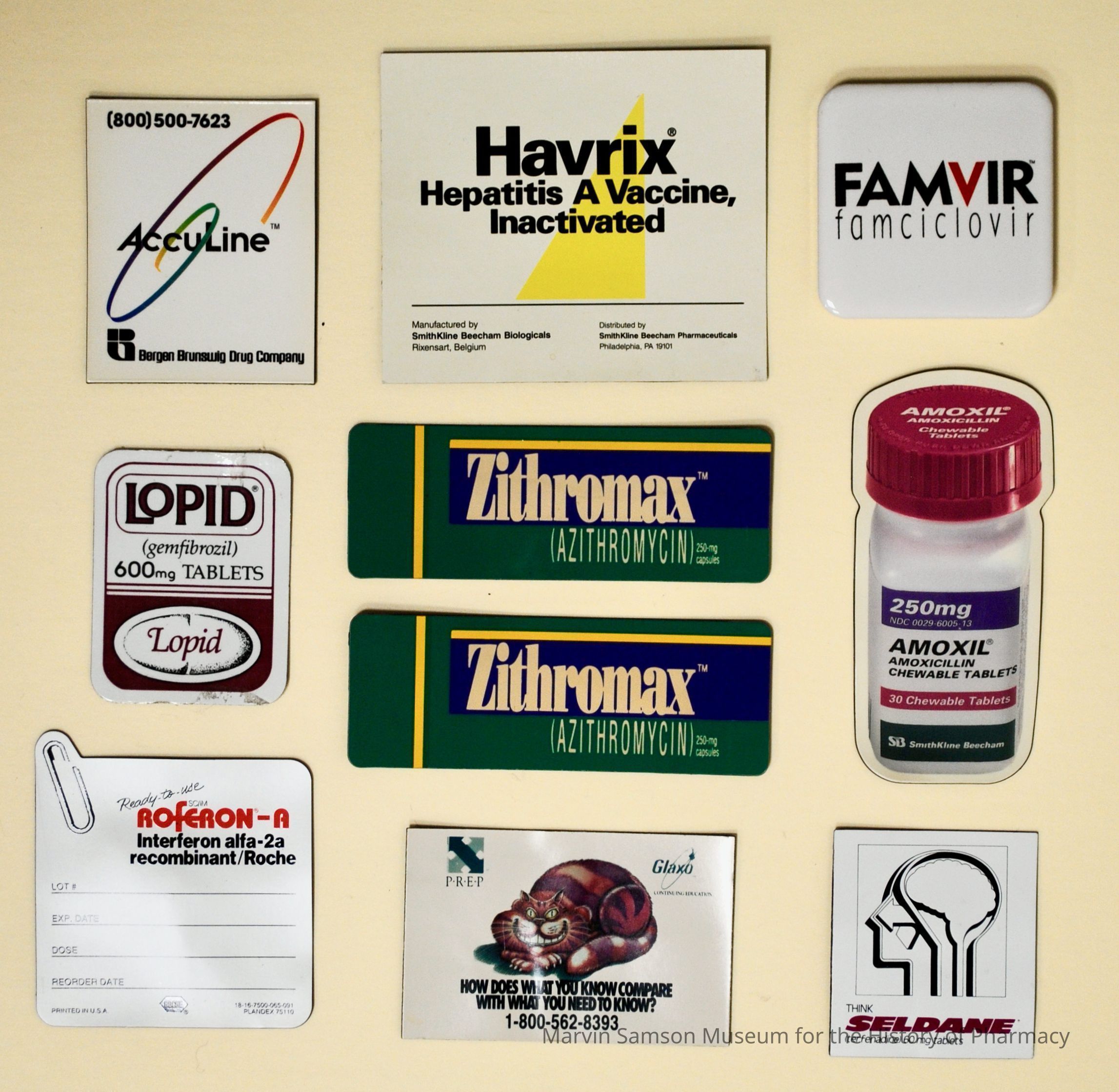 White rectangular magnet advertising "PREP Glaxo," and printed with an image of a Cheshire cat and the text: "How does what you know compare with what you need to know?"Made/Created
