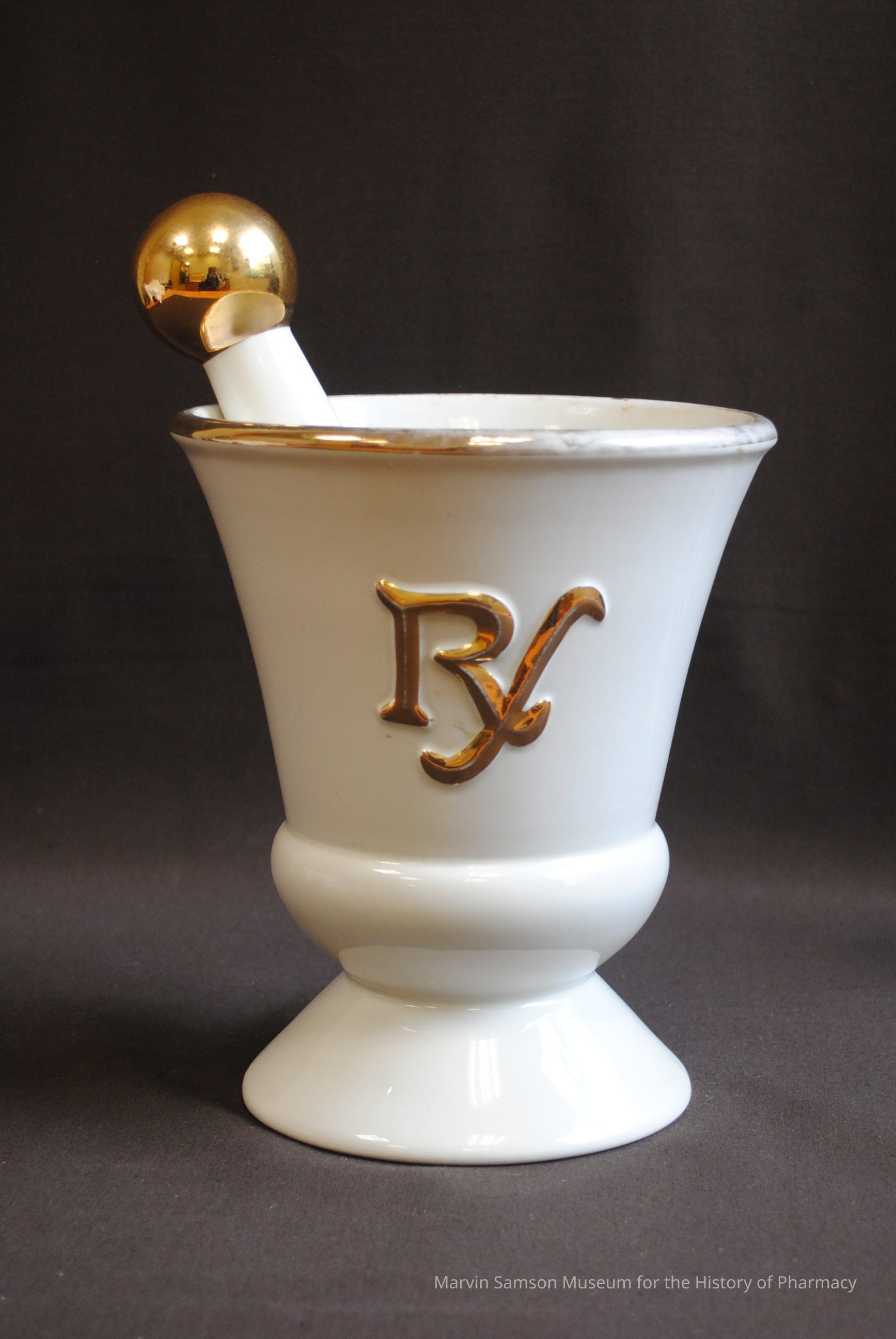 White ceramic mortar and pestle with gilded accents including "Rx" symbol on mortar's exteriorContext