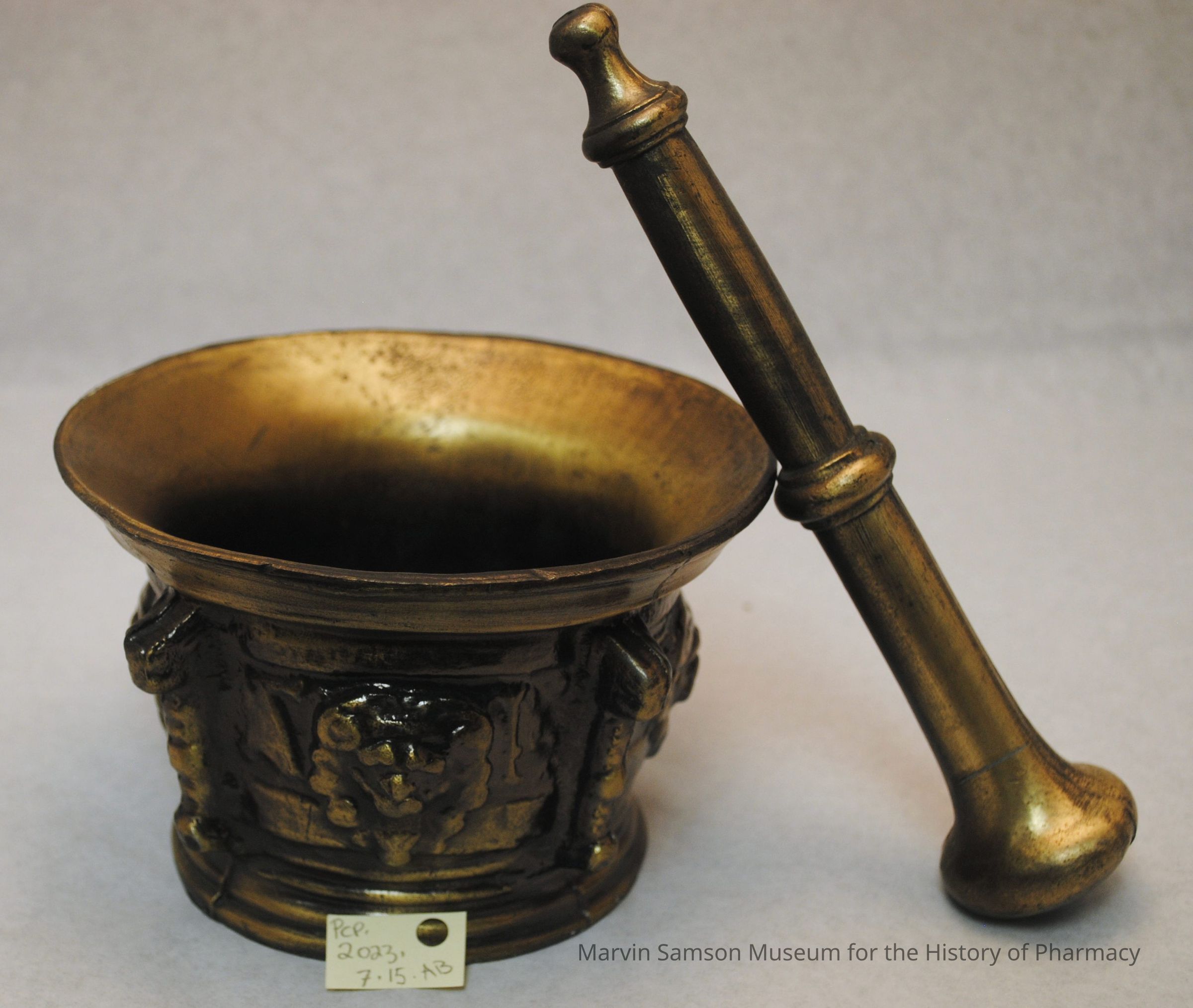 Cast metal mortar and pestle with bronze-like patina; reproduction of a 17th-century European designCategory