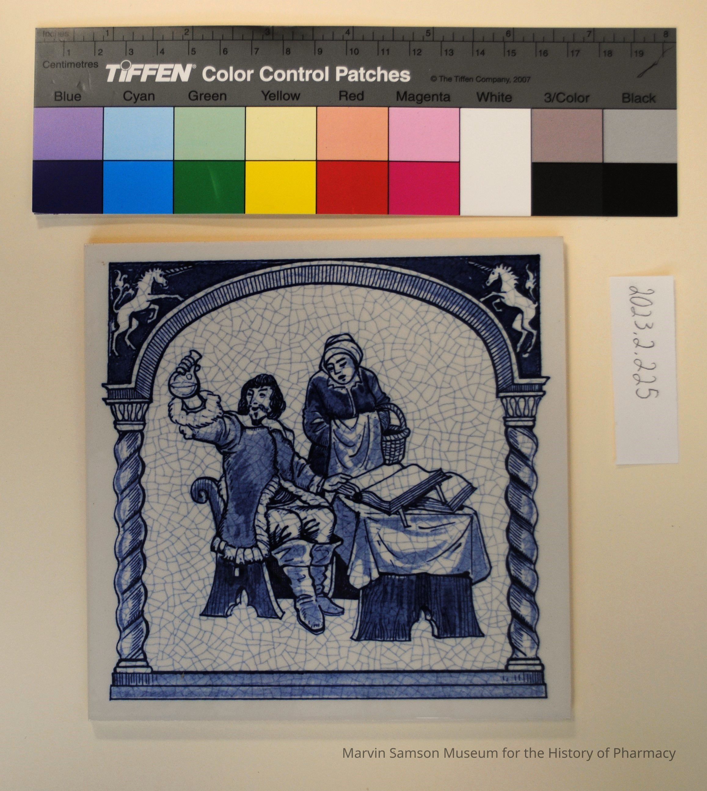 Blue and white ceramic tile depicting a man seated at a table with open books holding up a beaker filled with liquid while a woman holding a basket looks on. Part of a set of Dutch Delft tiles depicting 17th century apothecary scenes produced by Burroughs Wellcome Co. between 1985 and 1995 to raise funds for their pharmacy education program.Collection
