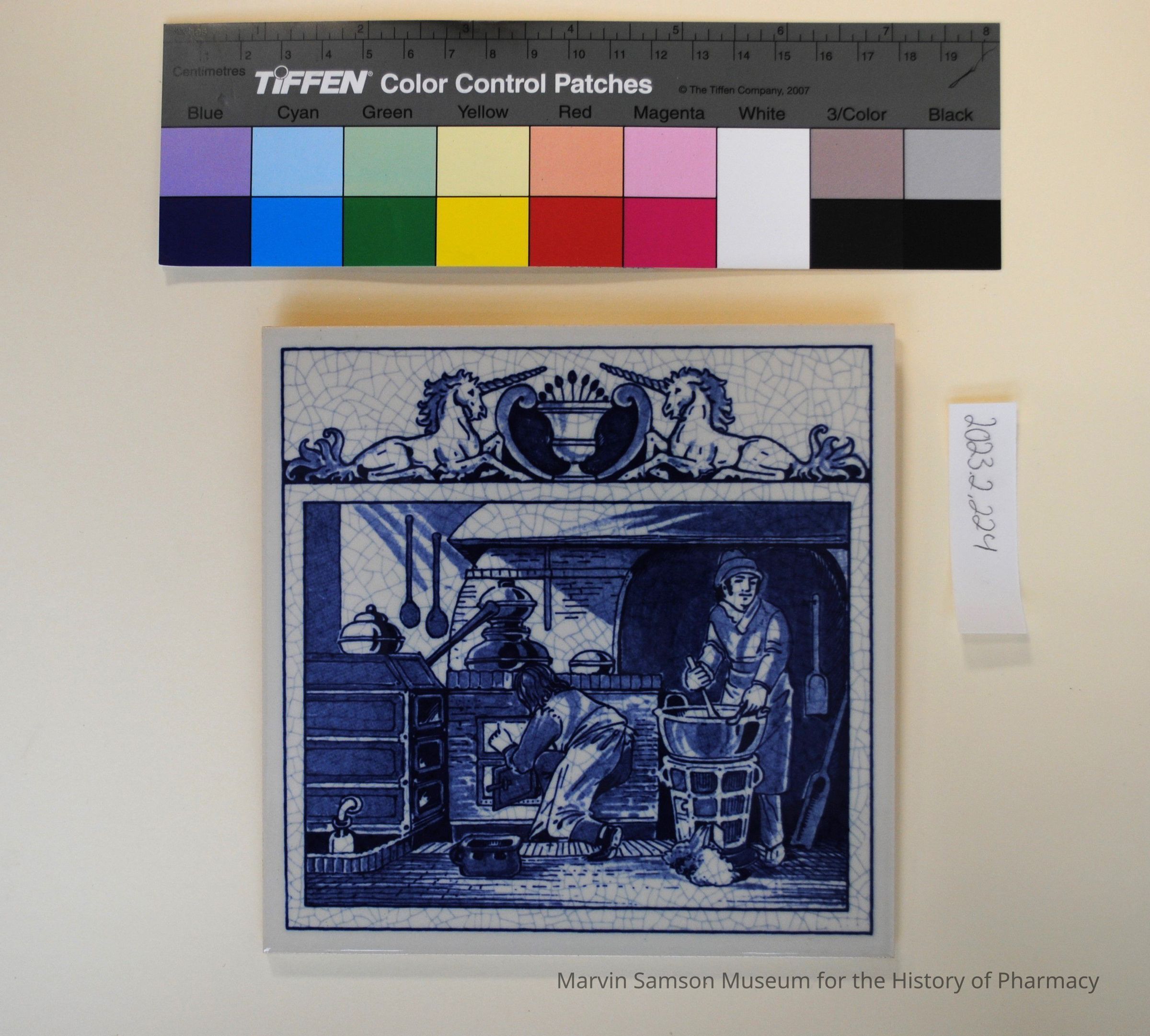 Blue and white ceramic tile depicting two apothecary men preparing medicine in a traditional Dutch apothecary oven. Part of a set of Dutch Delft tiles depicting 17th century apothecary scenes produced by Burroughs Wellcome Co. between 1985 and 1995 to raise funds for their pharmacy education program.Collection
