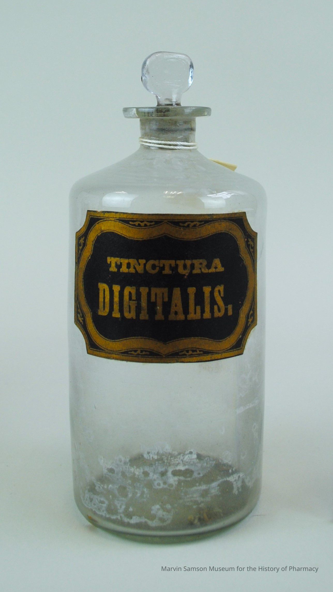 Glass bottle with glass stopper featuring a gold and black label reading "Tinctura Digitalis." [tincture of digitalis]
