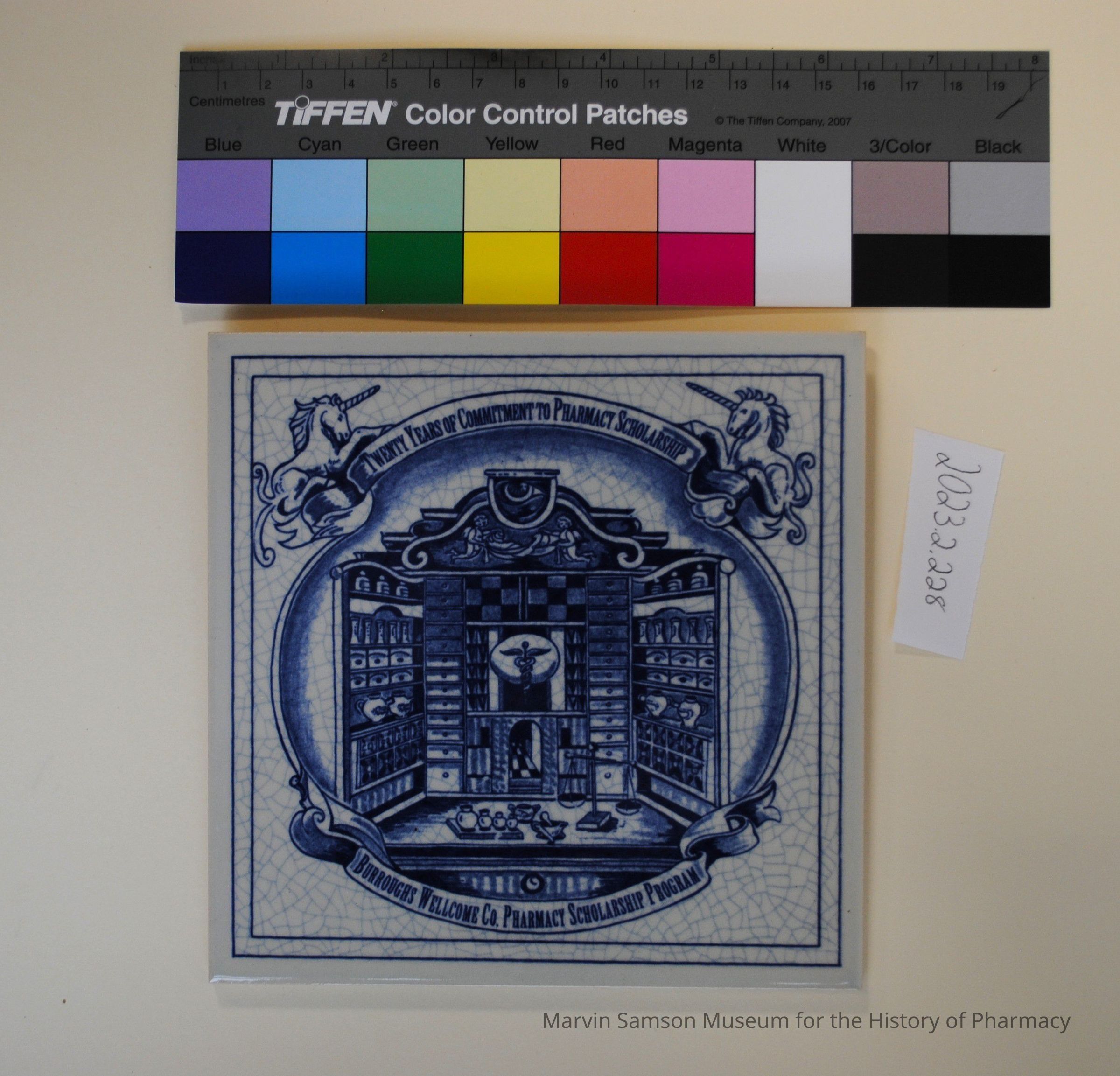 Blue and white ceramic tile depicting the interior of an apothecary window; banner above the image reads: "twenty years of commitment to pharmacy scholarship". Part of a set of Dutch Delft tiles depicting 17th century apothecary scenes produced by Burroughs Wellcome Co. between 1985 and 1995 to raise funds for their pharmacy education program.Collection