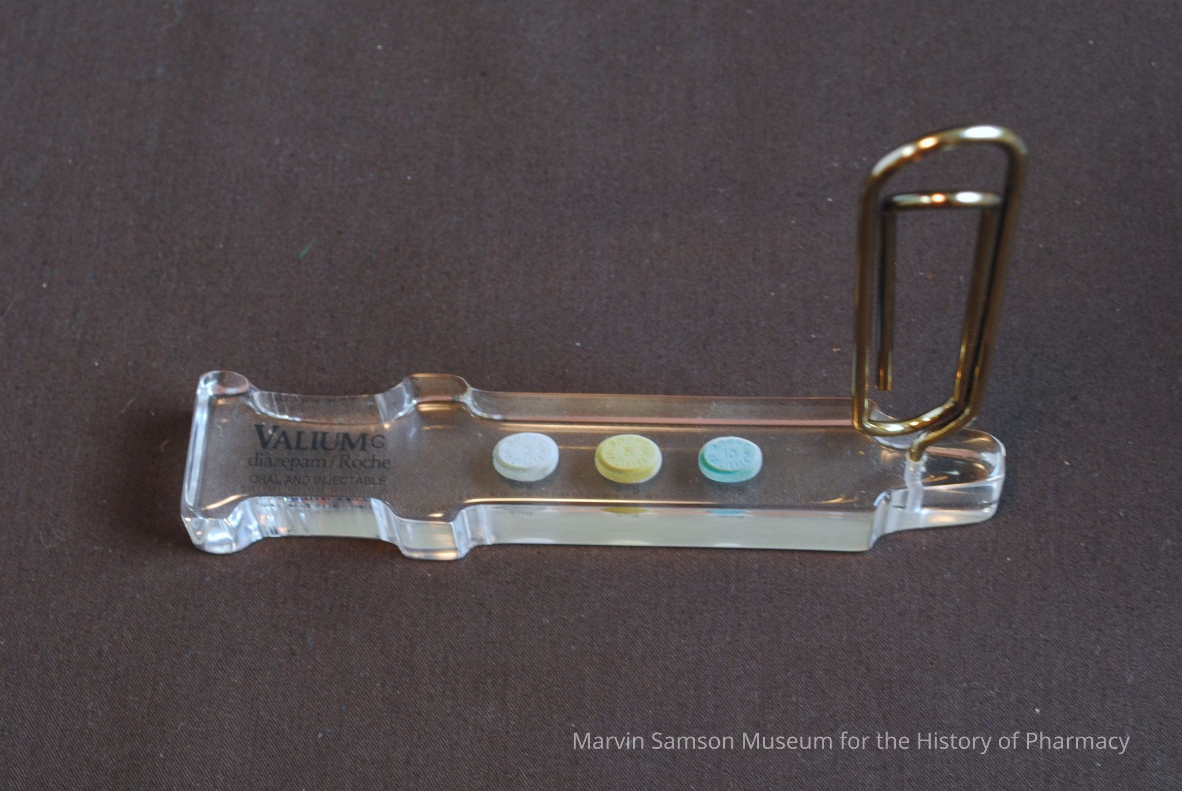 Clear acrylic paperweight with three round pills suspended inside and an upright metal paperclip attached, advertising: "Valium G, diazepam / Roche, oral and injectable"Context