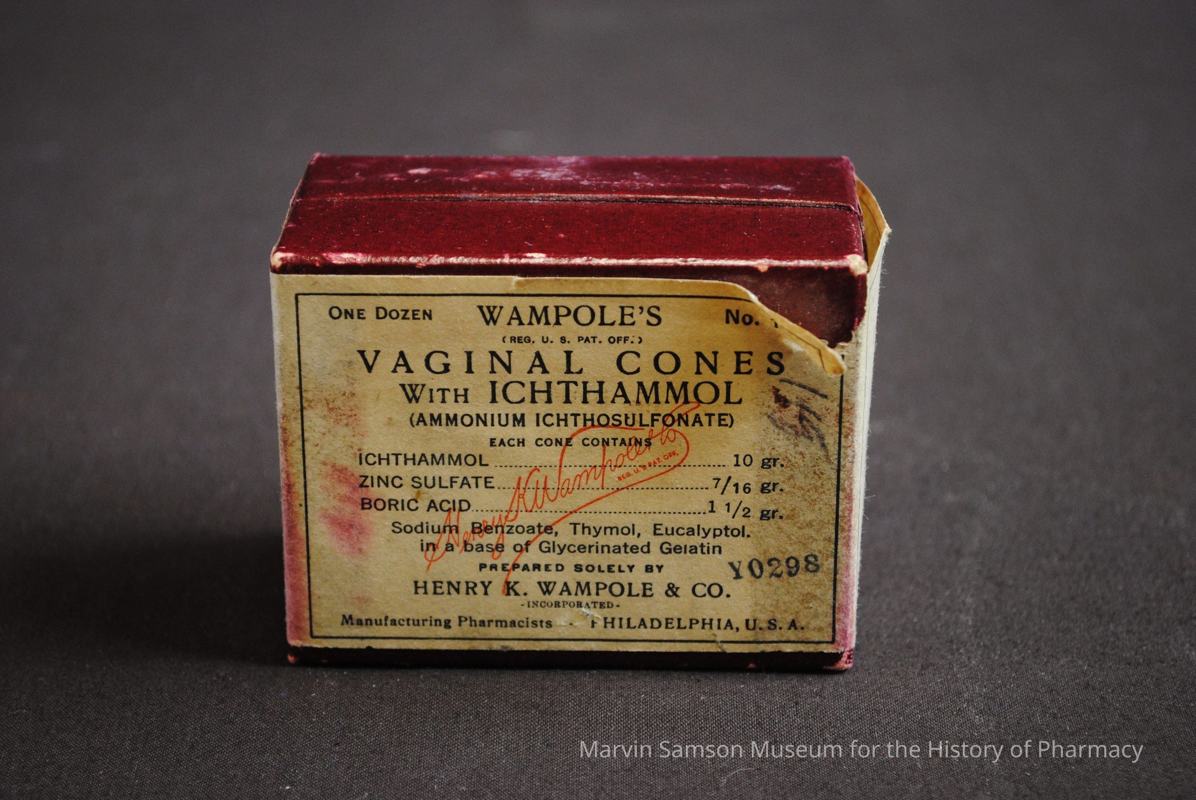Box containing one dozen Wampole's vaginal cones with ichthammol (ammonium lignosulfonate)