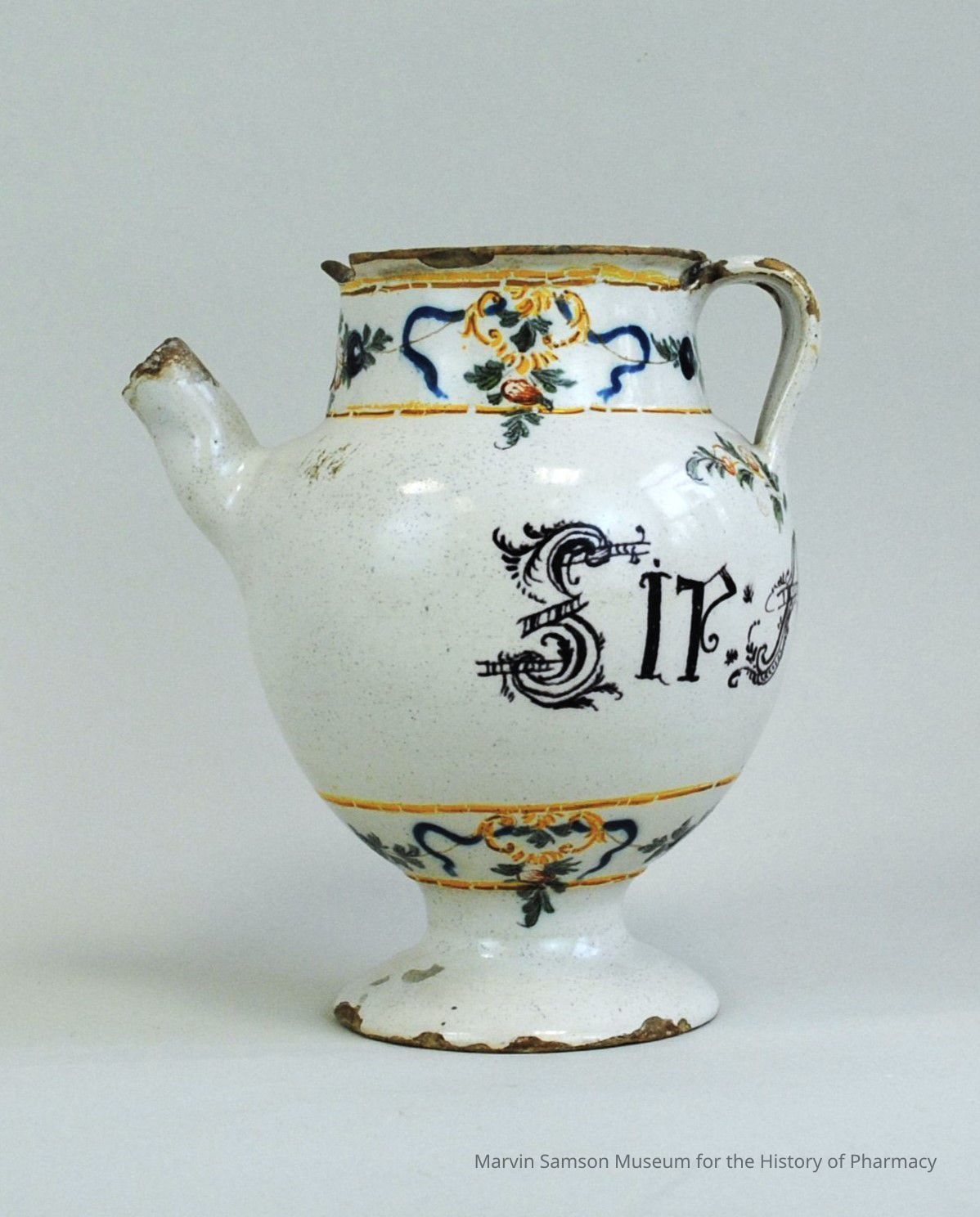 White drug jar with pouring spout decorated with blue and yellow vegetation and the Latin "Sir: Acid. Citr." [citric acid syrup]Made/Created