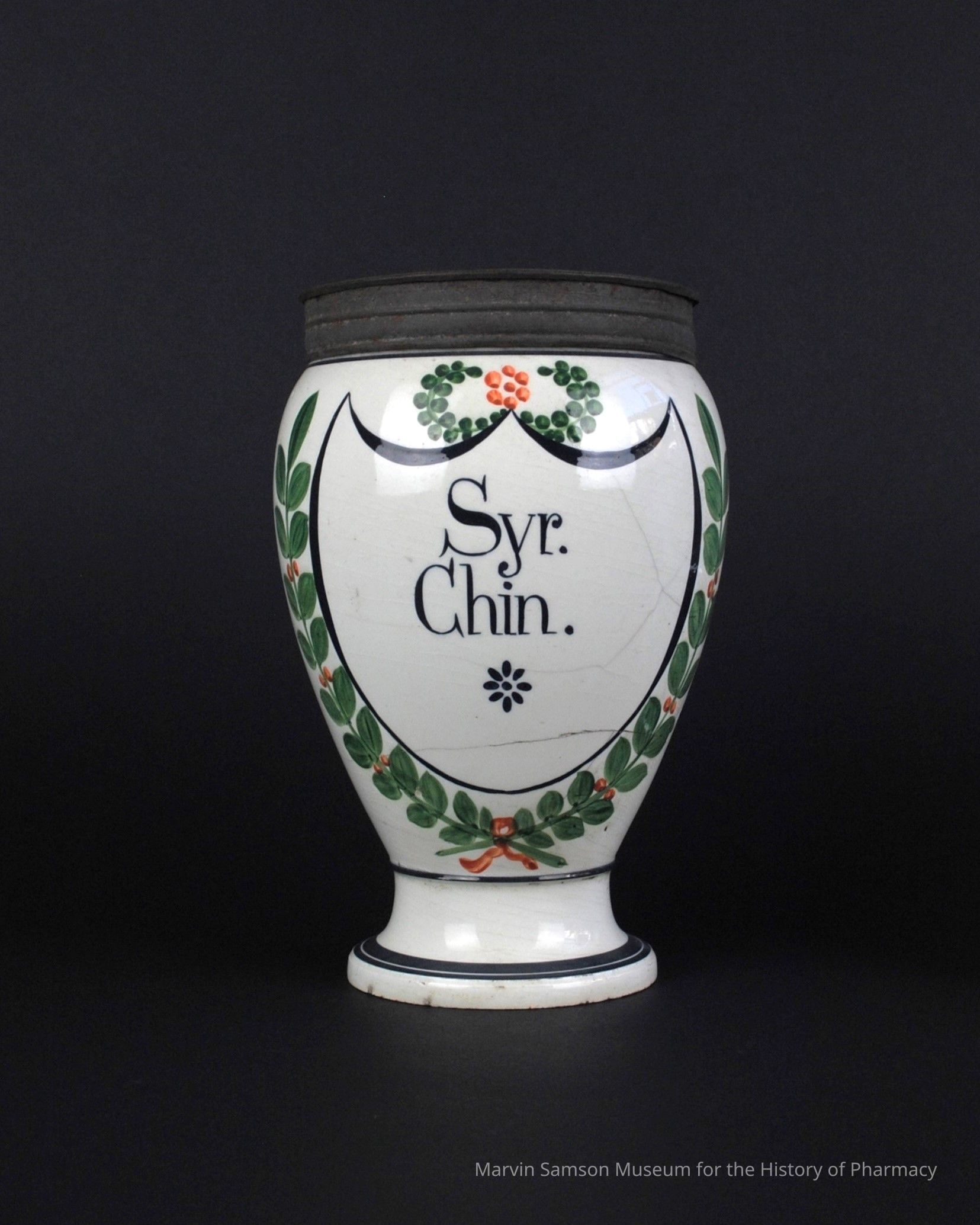 Off-white, spouted ceramic jar tapering at its base and with a flat tin lid. The jar is painted with the black outline of a crest with the text, "Syr. Chin.," [chinchona syrup] inscribed in its center and two green branches dotted with red berries crossed at its base like a wreath.Collection
